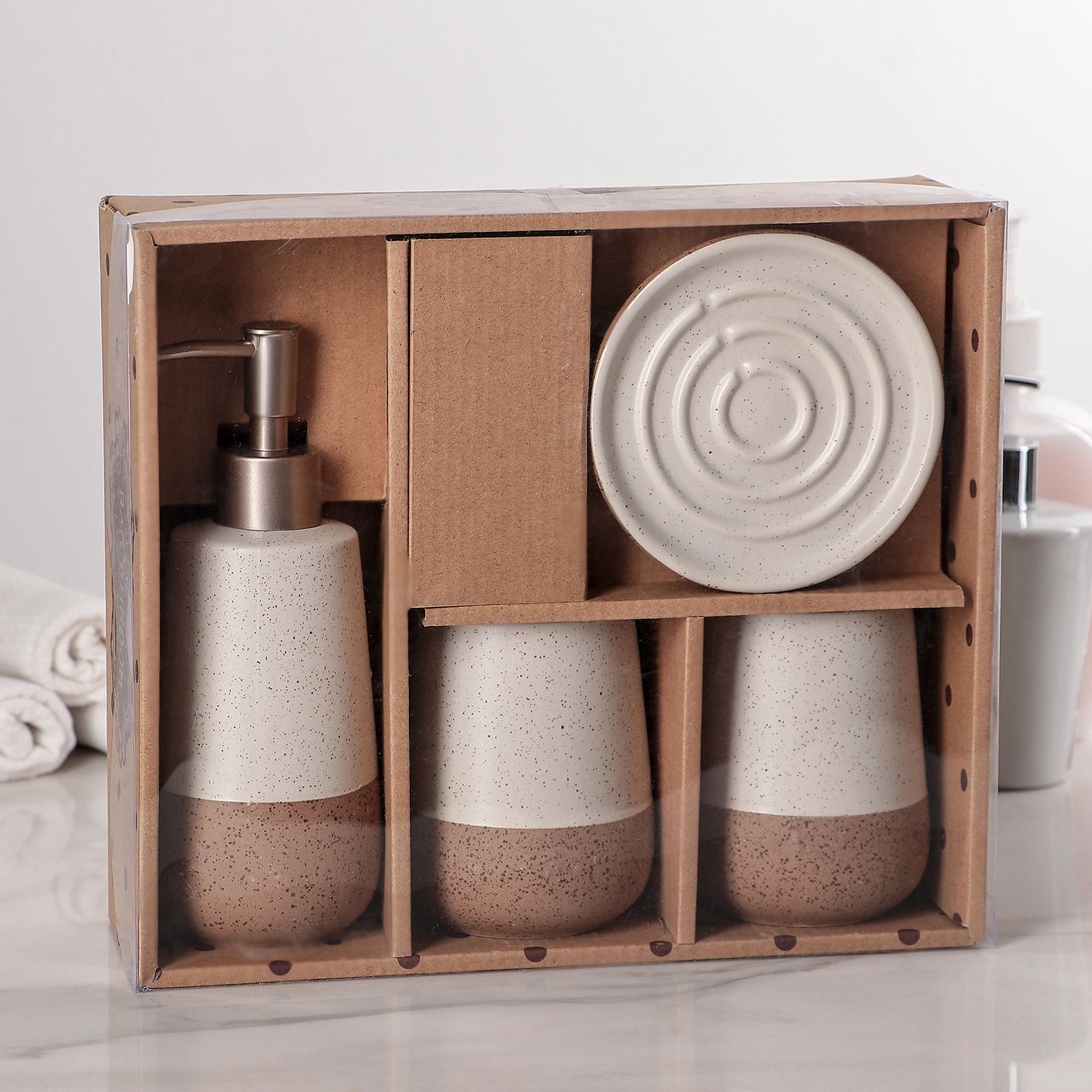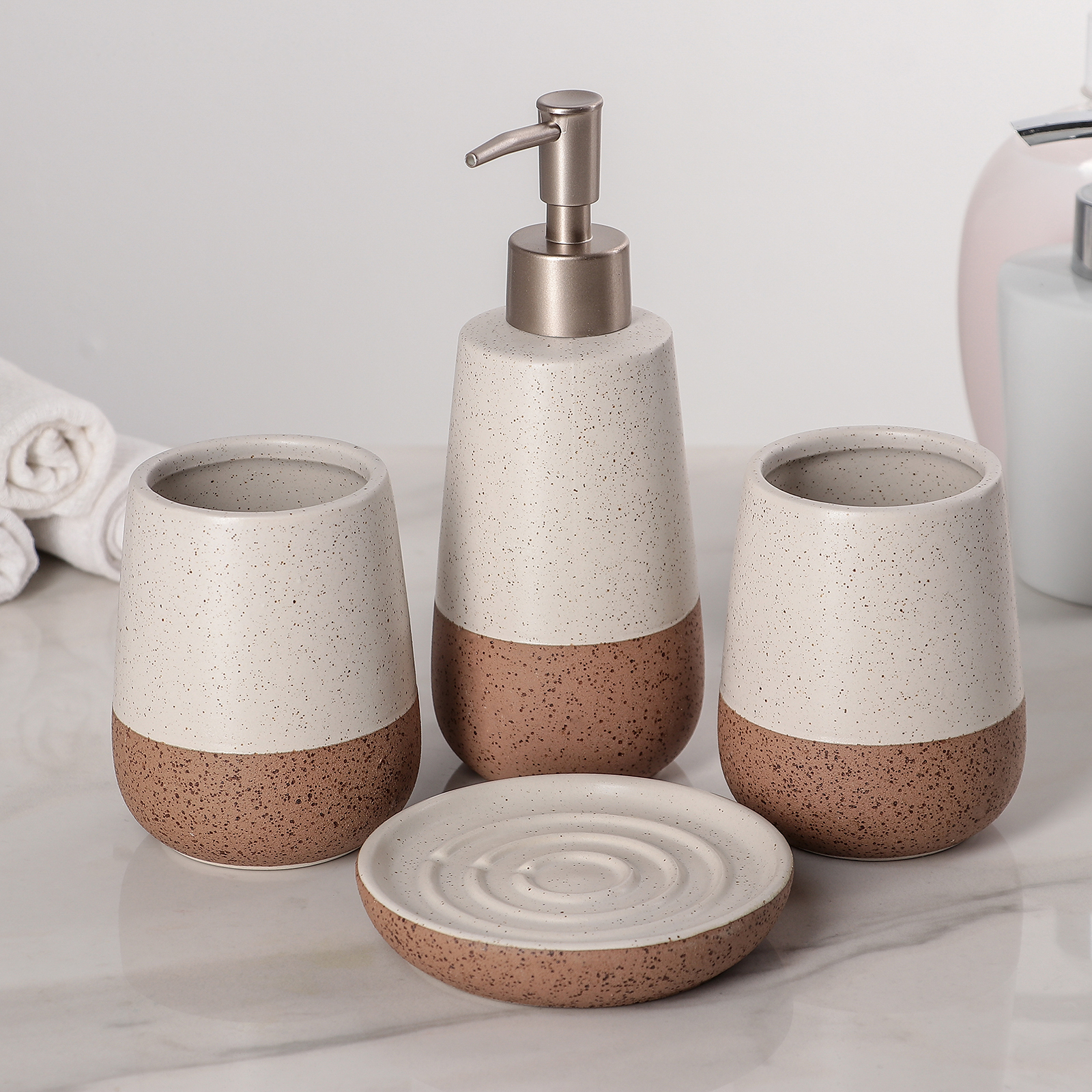 Набор аксессуаров организует пространство и станет стильным украшением Вашей ванной комнаты. За счет сдержанного дизайна данный керамический набор в ванную подойдет к любому дизайну ванной комнаты. Набор состоит из 4 предметов: 2 стакана, мыльница, дозатор.