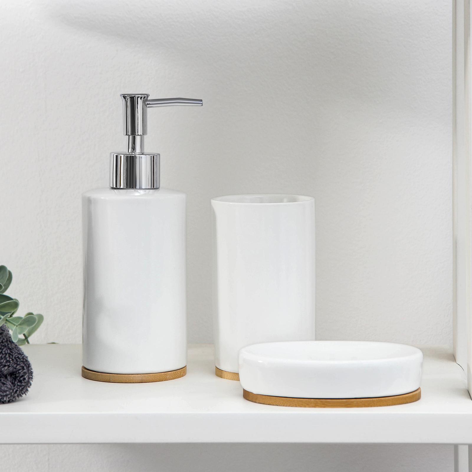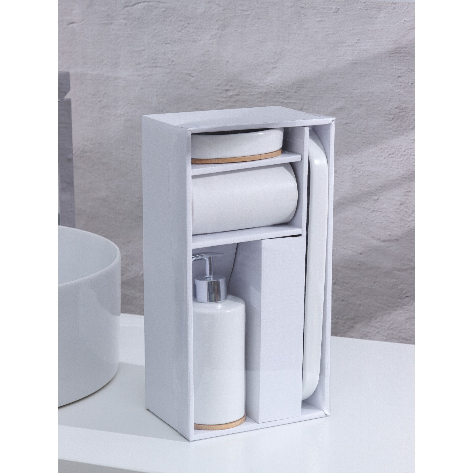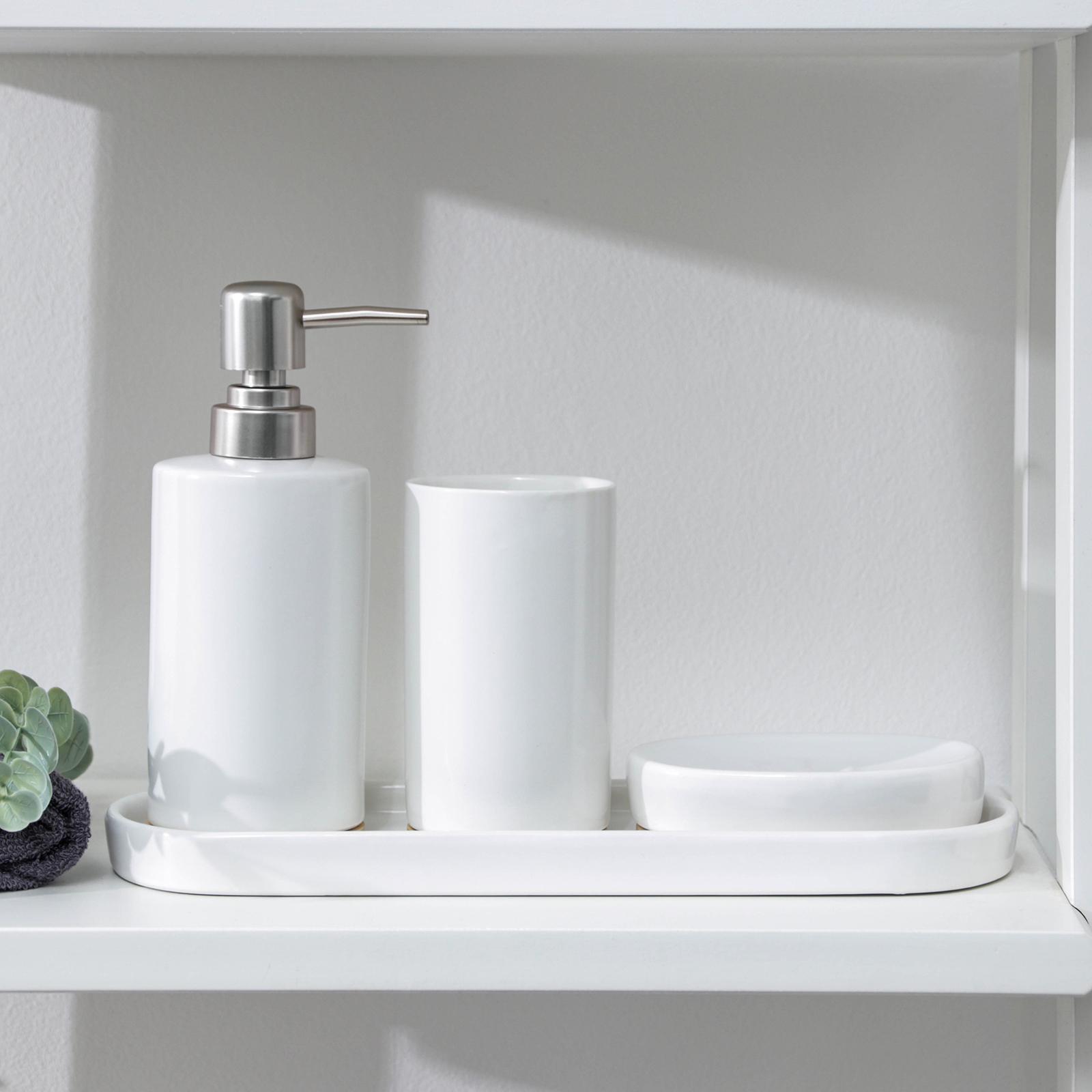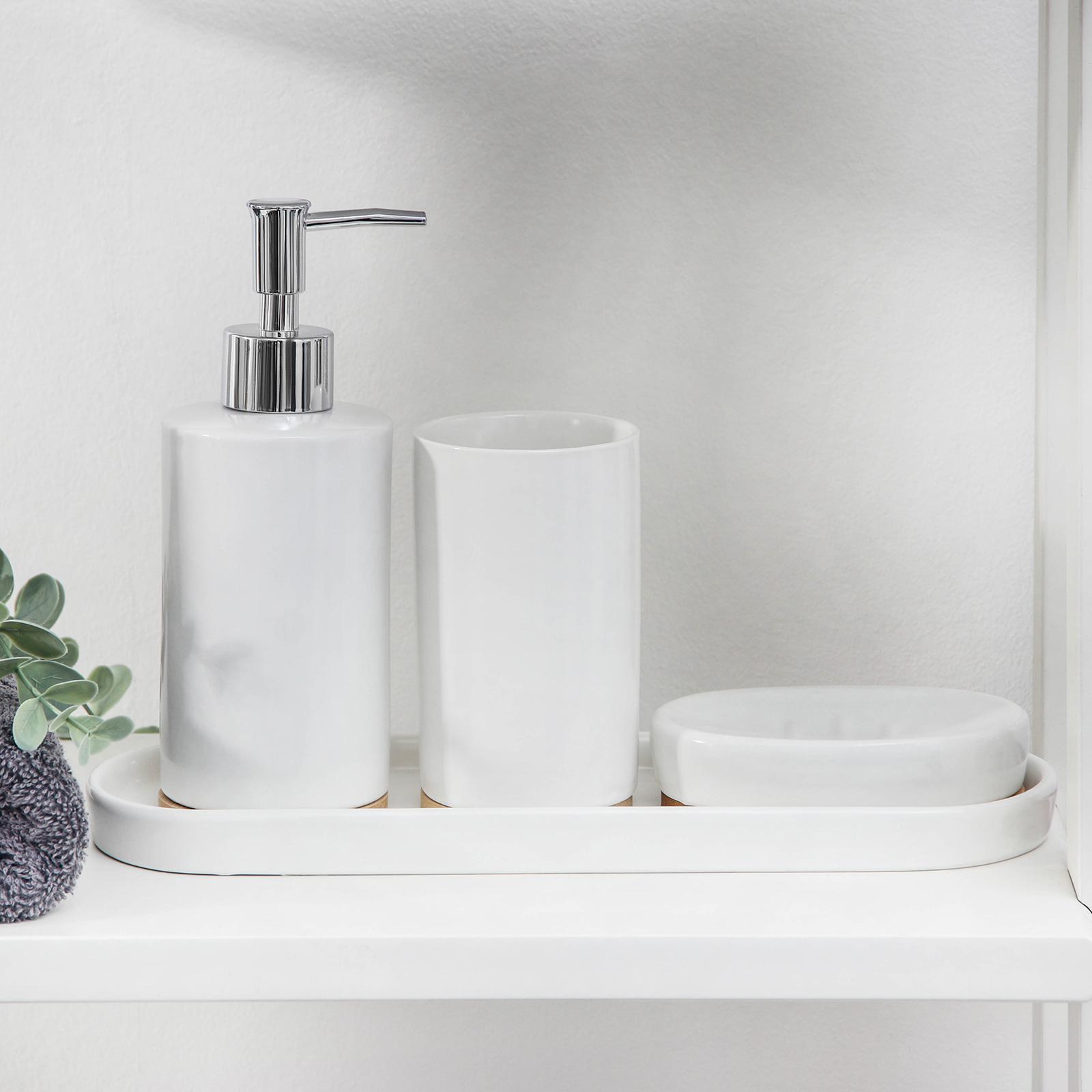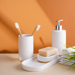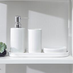 Набор аксессуаров организует пространство и станет стильным украшением Вашей ванной комнаты. За счет сдержанного дизайна данный керамический набор в ванную подойдет к любому дизайну ванной комнаты. Набор состоит из 4 предметов: 2 стакана, мыльница, дозатор.