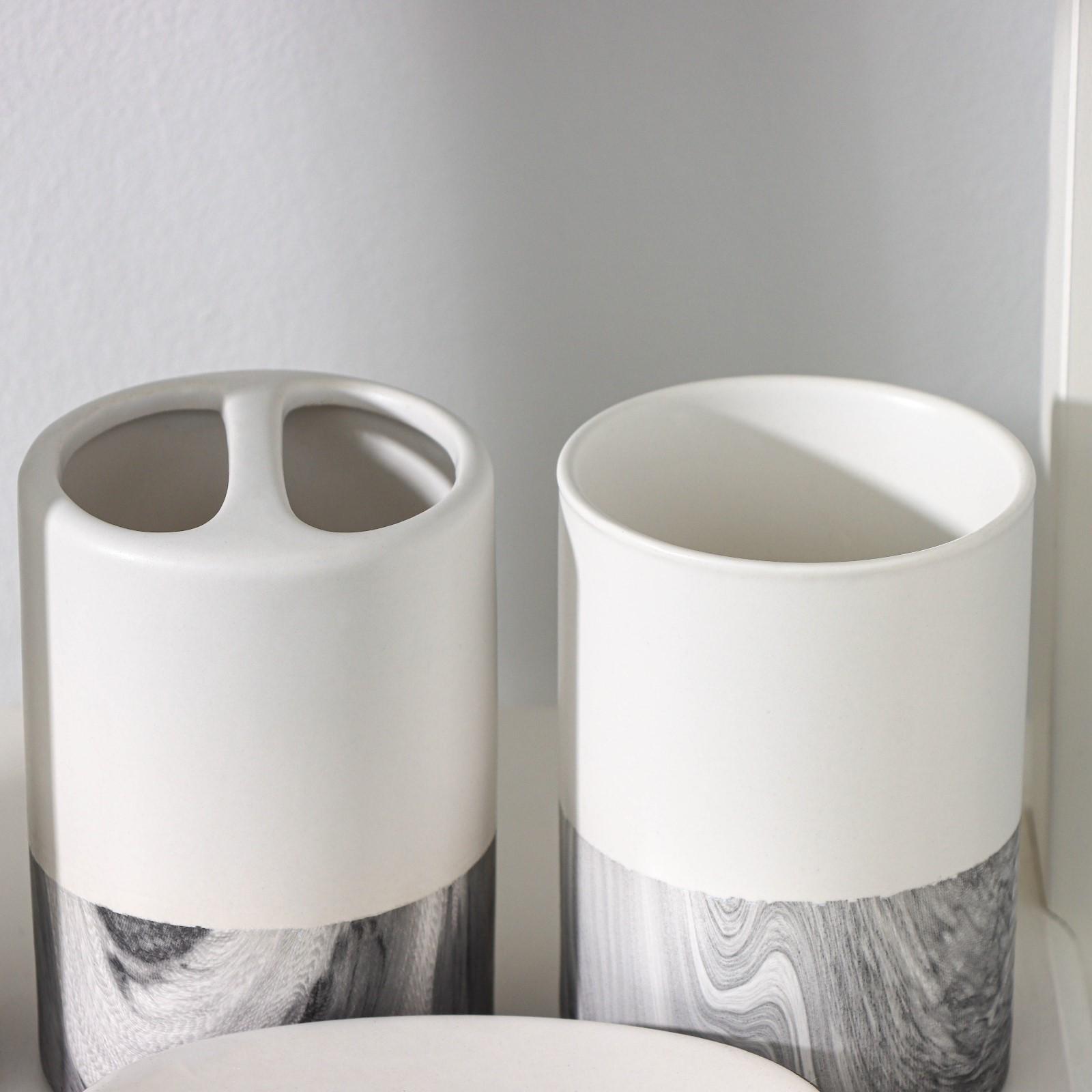 Набор аксессуаров организует пространство и станет стильным украшением Вашей ванной комнаты. За счет сдержанного дизайна данный керамический набор в ванную подойдет к любому дизайну ванной комнаты. Набор состоит из 4 предметов: 2 стакана, мыльница, дозатор.
