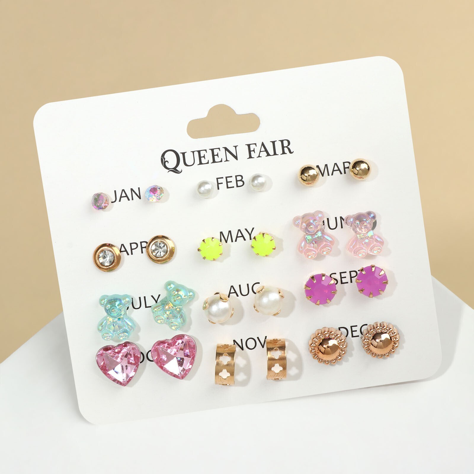 Пусеты 12 пар "Фантазия" мишки и сердечки, цветной в золоте