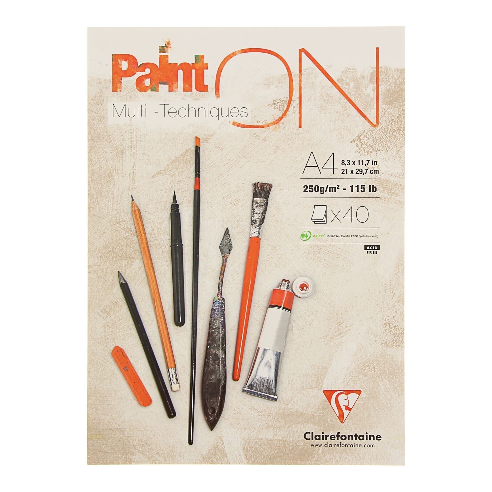 Альбомы серии PAINT ON французской компании ClaireFontaine предназначены для смешанных техник: работы с акрилом, гуашью, чернилами, сухой и масляной пастелью. Бескислотная бумага плотностью 250 г/м² сертифицирована по стандарту PEFC.
