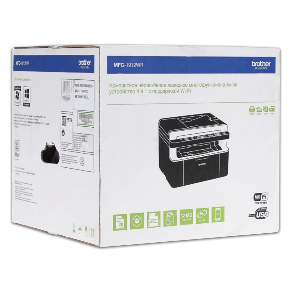 Компактное многофункциональное черно-белое лазерное устройство МФУ MFC-1912WR — это идеальное многофункциональное решение для домашнего офиса, оснащенное множеством полезных функций. Устройство: копир, принтер, сканер, факс. Технология печати: лазерная. Нагрузка: 10000 стр. в месяц. Максимальный формат: А4. Скорость печати и копирования: 20 стр./мин. (ч/б А4). Разрешение сканера: 600x1200 dpi. Устройство автоподачи оригиналов для сканирования: одностороннее. Емкость входного лотка: 150 листов. Емкость выходного лотка: 50 листов. Минимальная плотность бумаги: 65 г/м2. Максимальная плотность бумаги: 105 г/м2. Поддерживаемые типы нестандартной бумаги: глянцевая бумага, карточки, конверты, матовая бумага, пленки, этикетки. Интерфейсы подключения: USB, Wi-Fi. Поддержка ОС: Linux, Mac OS, Windows. Телефонная трубка: нет. Комплект поставки: документация, кабель USB в комплект не входит, код для заказа: 1,8 м - 511270, 3 м - 512101, комплект картриджей, крышка копира. Количество картриджей в комплекте: 1 шт. Ширина: 38.5 см. Высота: 28.3 см. Глубина: 34 см. Вес: 8.2 кг Бренд - BROTHER. Производитель - Вьетнам. Артикул - MFC-1912WR. Штрихкод - 4977766743778