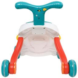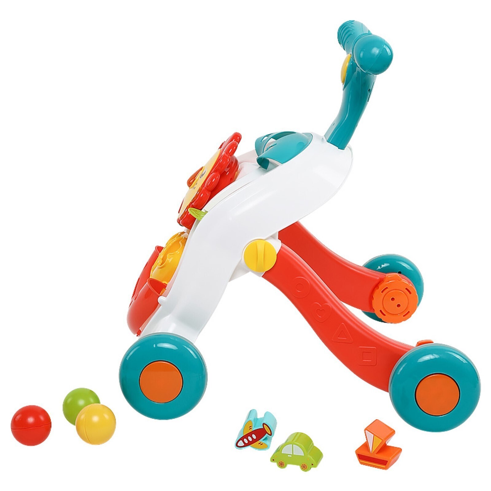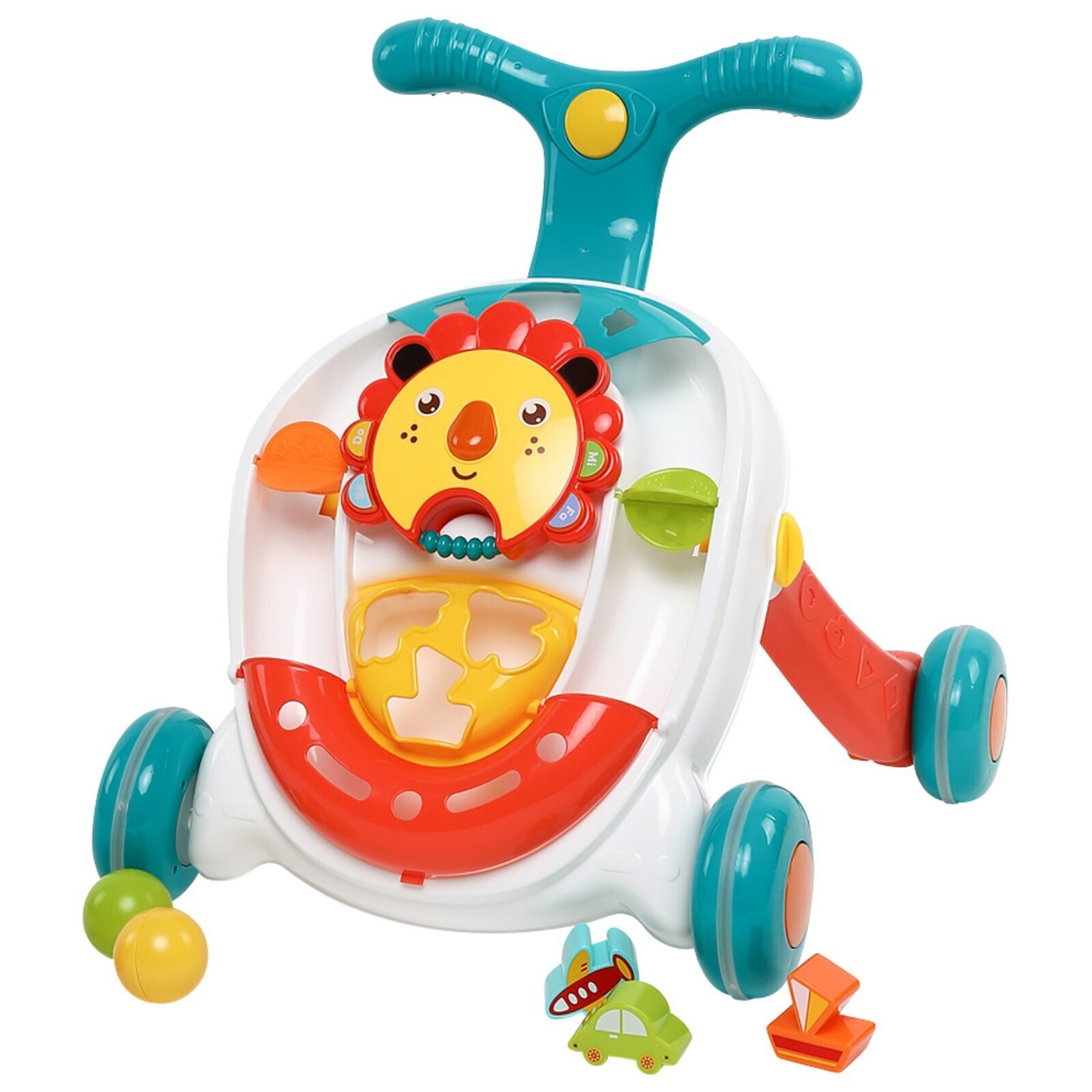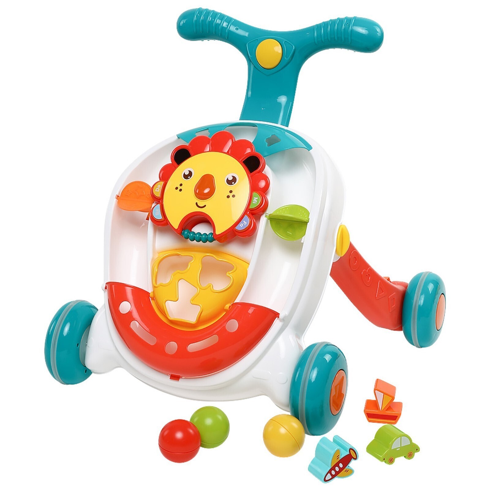 На передней части сортера располагается съёмная голова льва с подвижными и светящимися элементами. Удобная ручка на вершине сортера позволит малышу комфортно возить его, как коляску, помогая в ходьбе. Колёса также можно сделать неподвижными с помощью надежной фиксации.