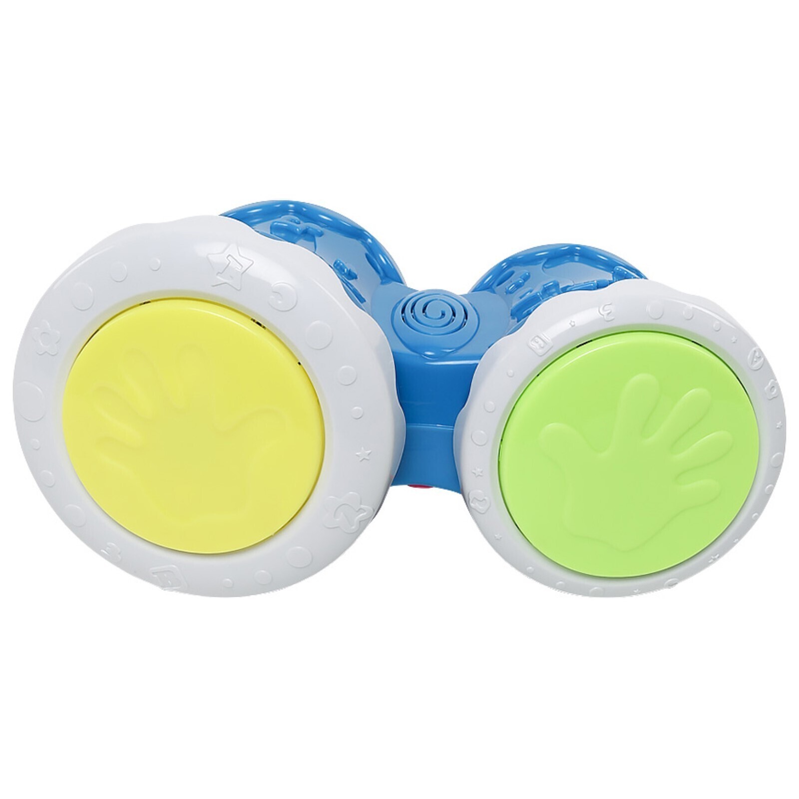 Игрушка выглядит как двухсоставной барабан с синим основанием. При нажатии на звуковые кнопки раздаются занятные мелодии с подсветкой барабанного поля.