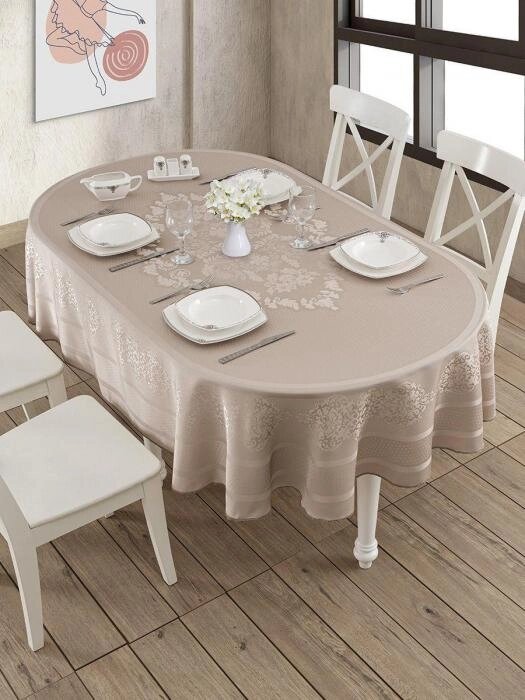 Скатерть овальная на стол тканевая бежевая праздничная для кухни столовой 160х220