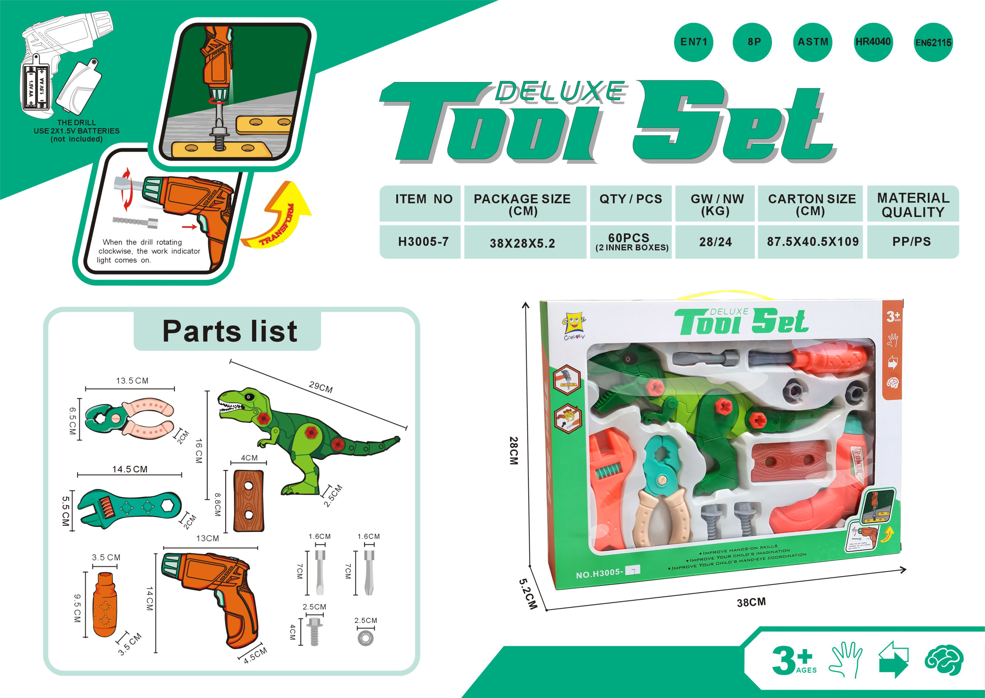 Игровой набор "Умелые руки"Материал: пластикКомплектность: разборная модель динозавра, плоскогубцы, разводной ключ, отвертка, болты, гайки, плашки, аккумуляторная отвертка (работает от 2 батареек типа АА - в комплект не входят)Упаковка: цветная картонная коробкаРазмеры упаковки: 38х5.2х28 см