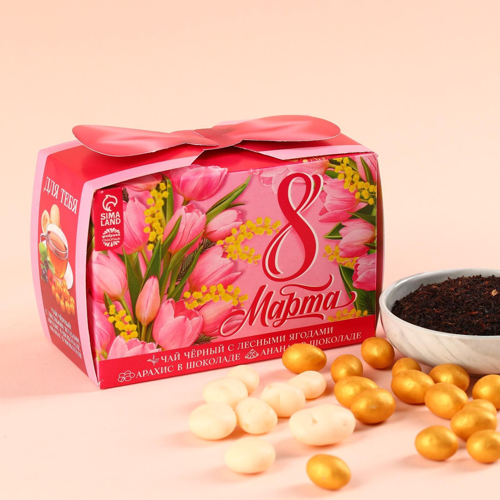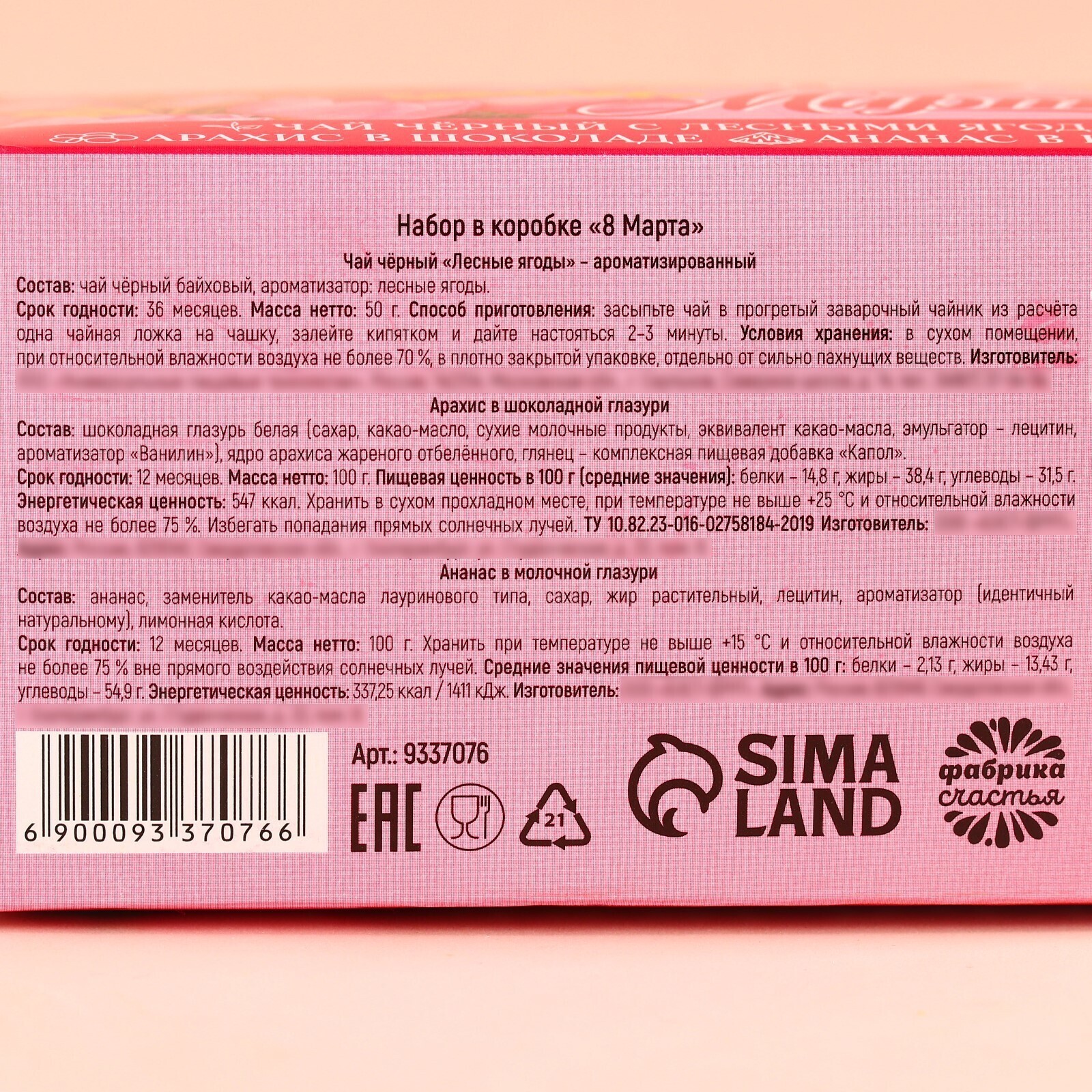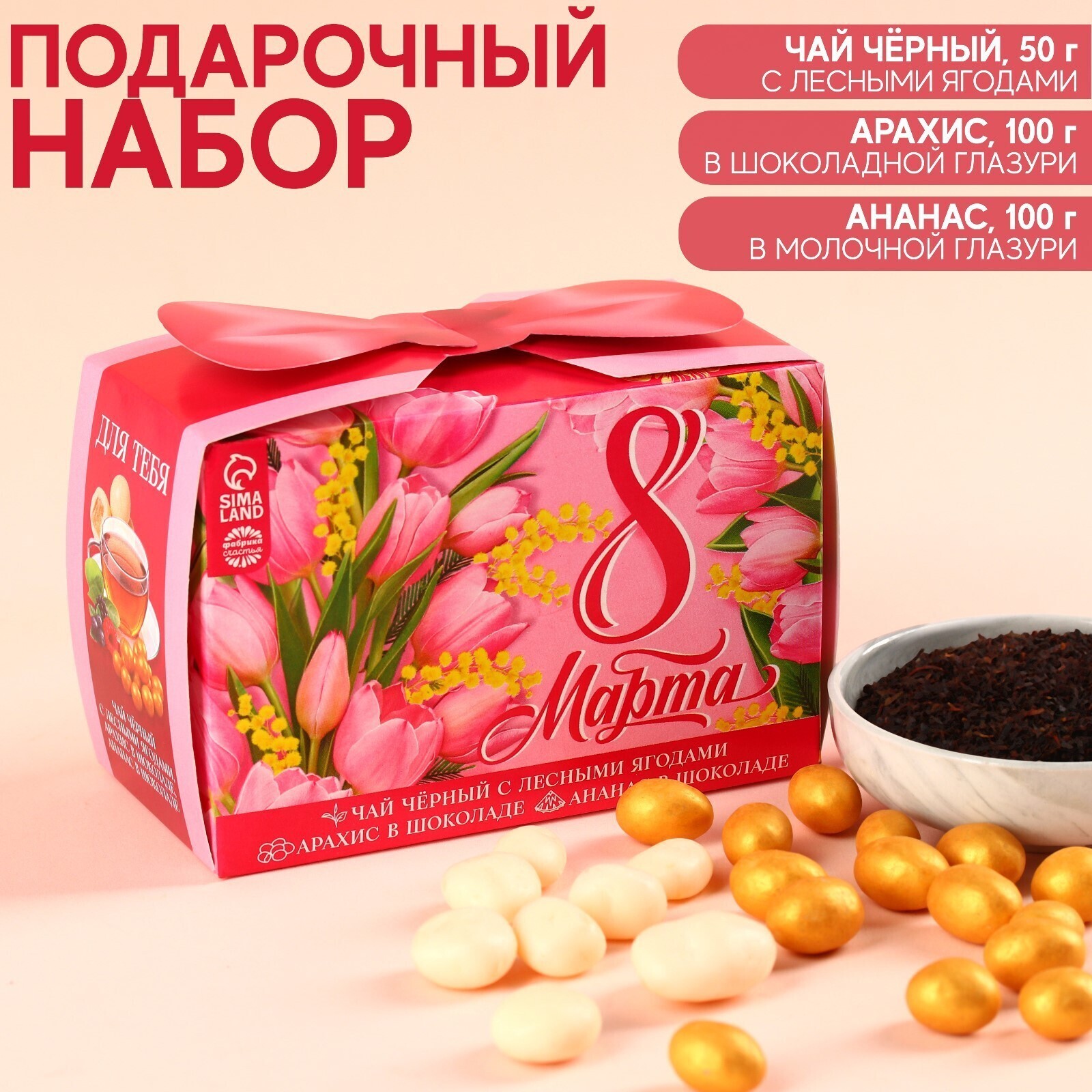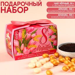 Набор «8 марта» в коробке, чай чёрный со вксом лесных ягод 50 г., арахис в глазури 100 г., ананас в глазури 100 г.