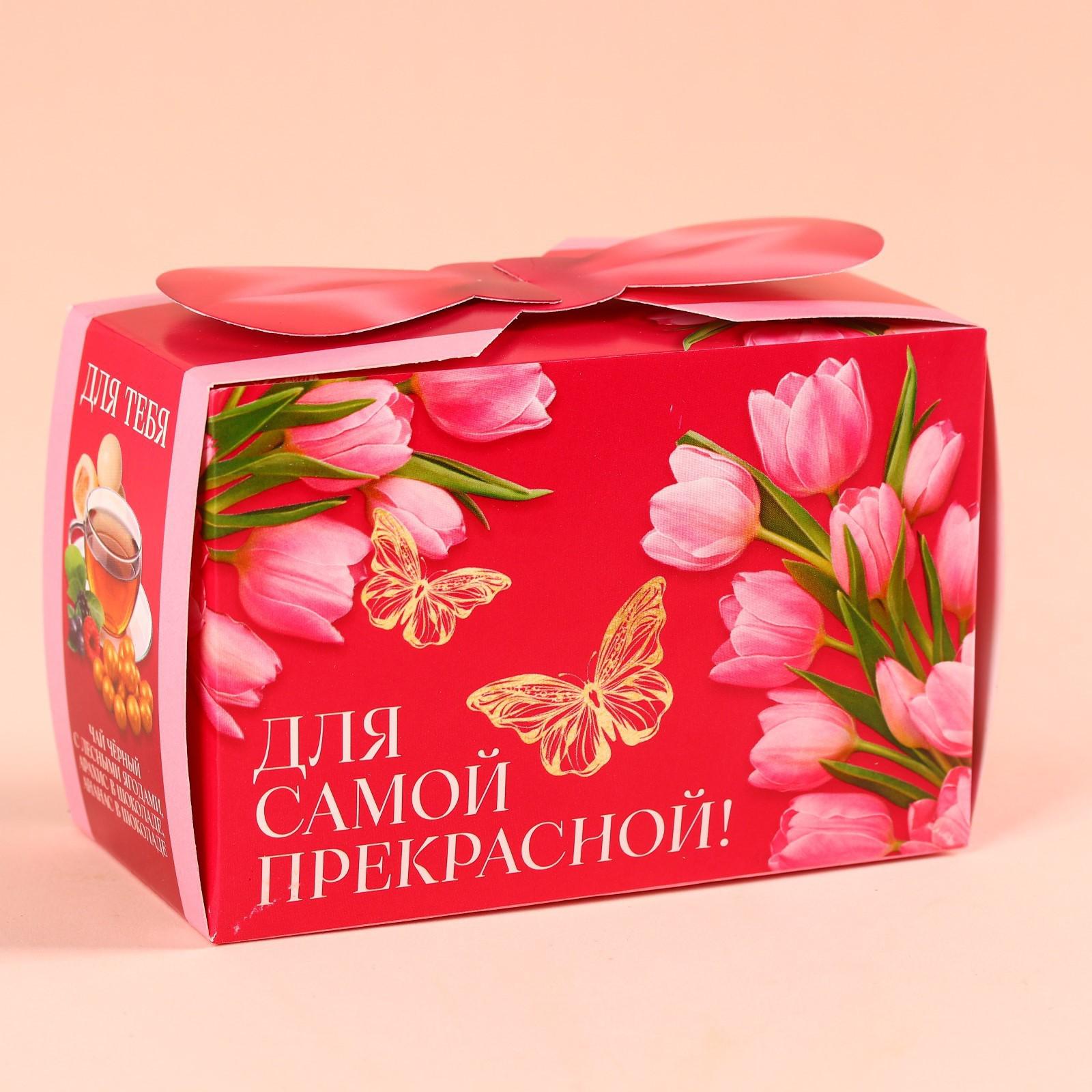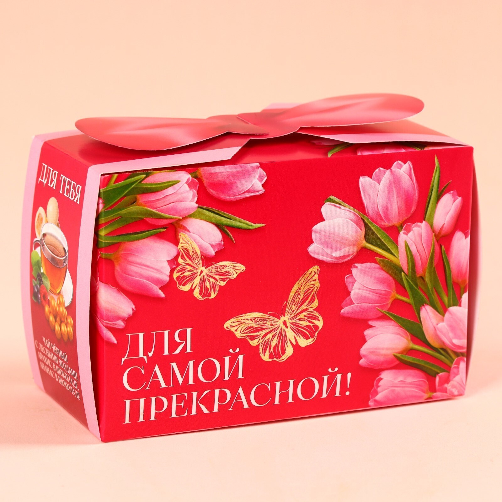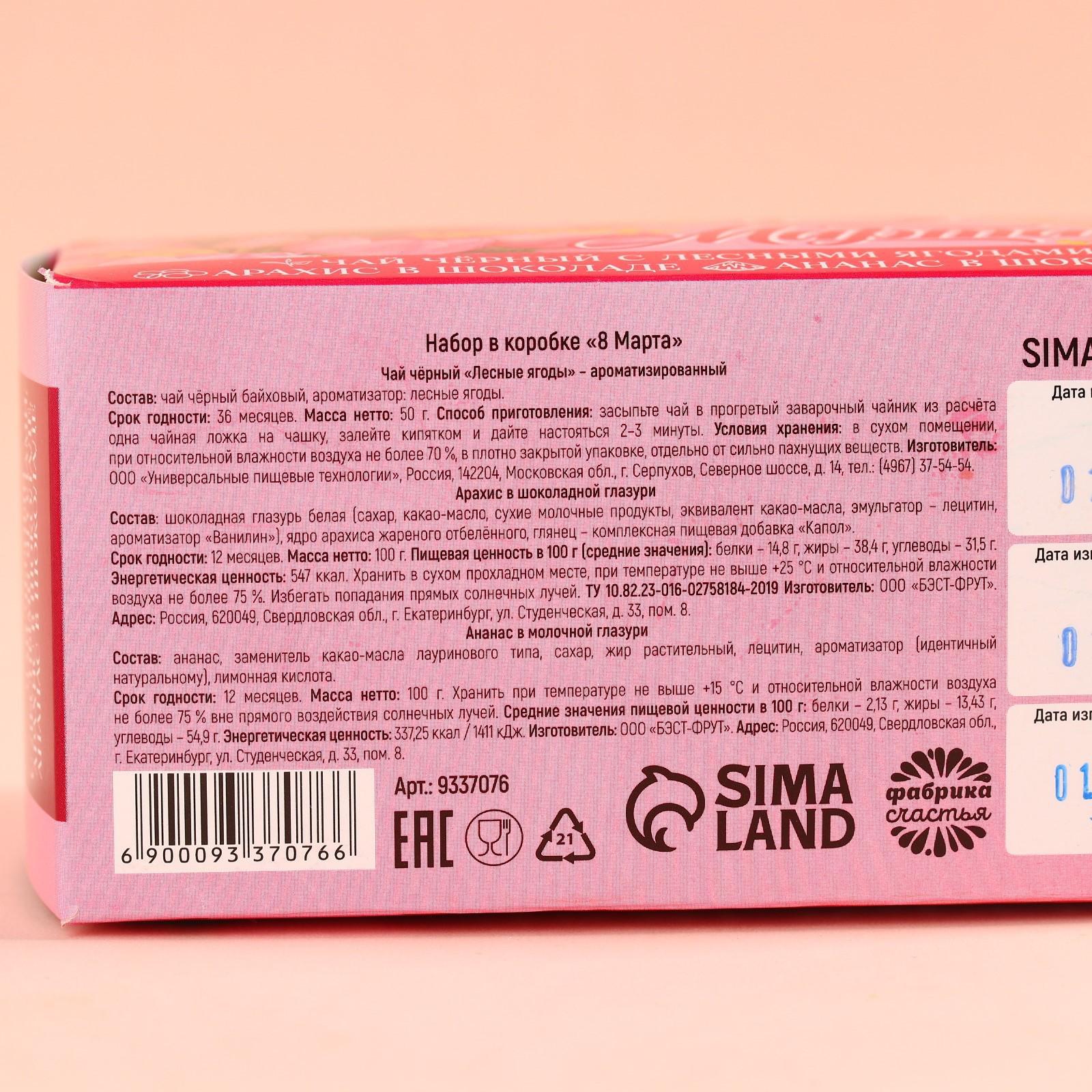 Набор «8 марта» в коробке, чай чёрный со вксом лесных ягод 50 г., арахис в глазури 100 г., ананас в глазури 100 г.