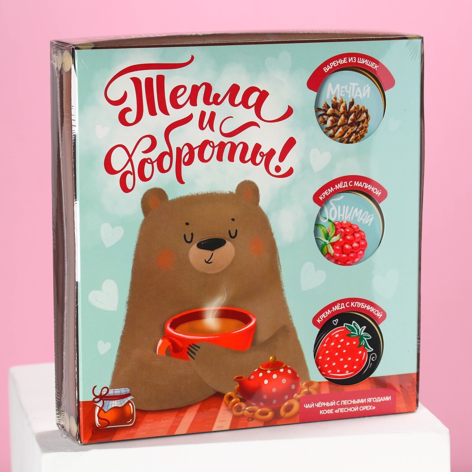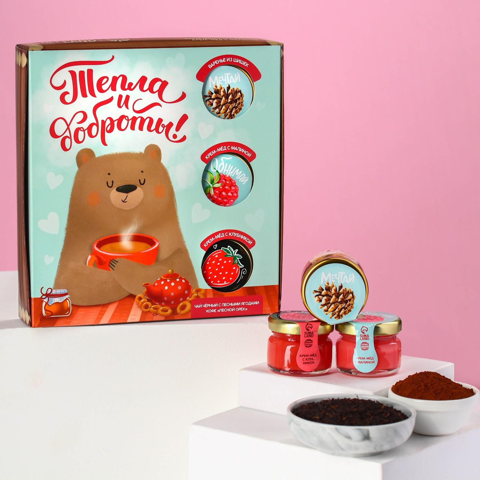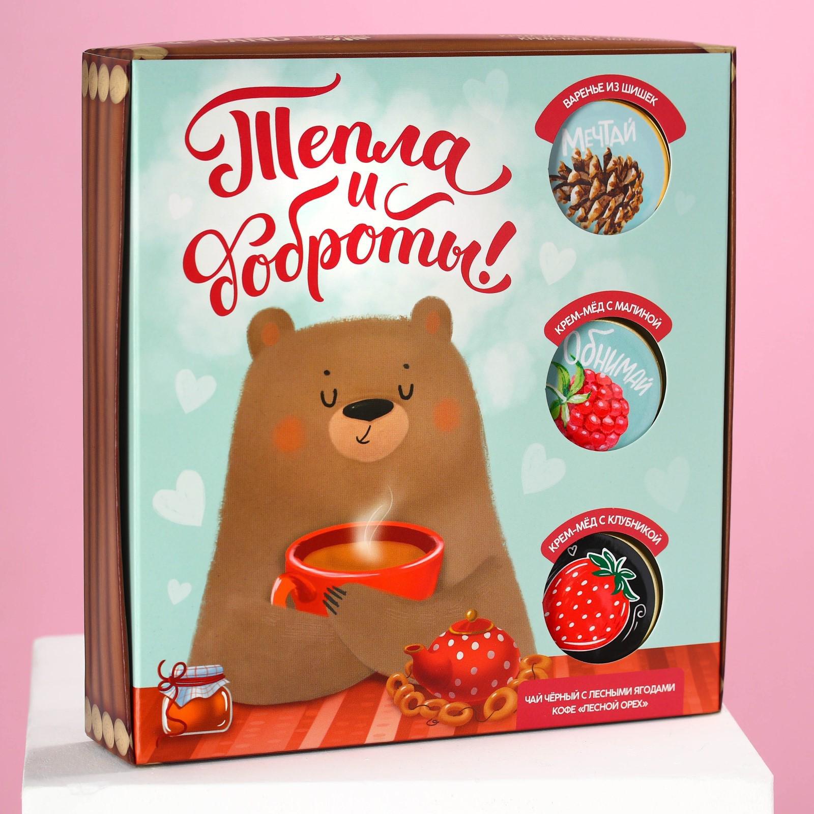Набор «Тепла и доброты», кофе со вкусом лесного ореха 50 г., чай чёрный со вкусом лесных ягод 50 г., варенье из шишек 30 г., крем-мёд с малиной 30 г., крем-мёд с клубникой 30 г.