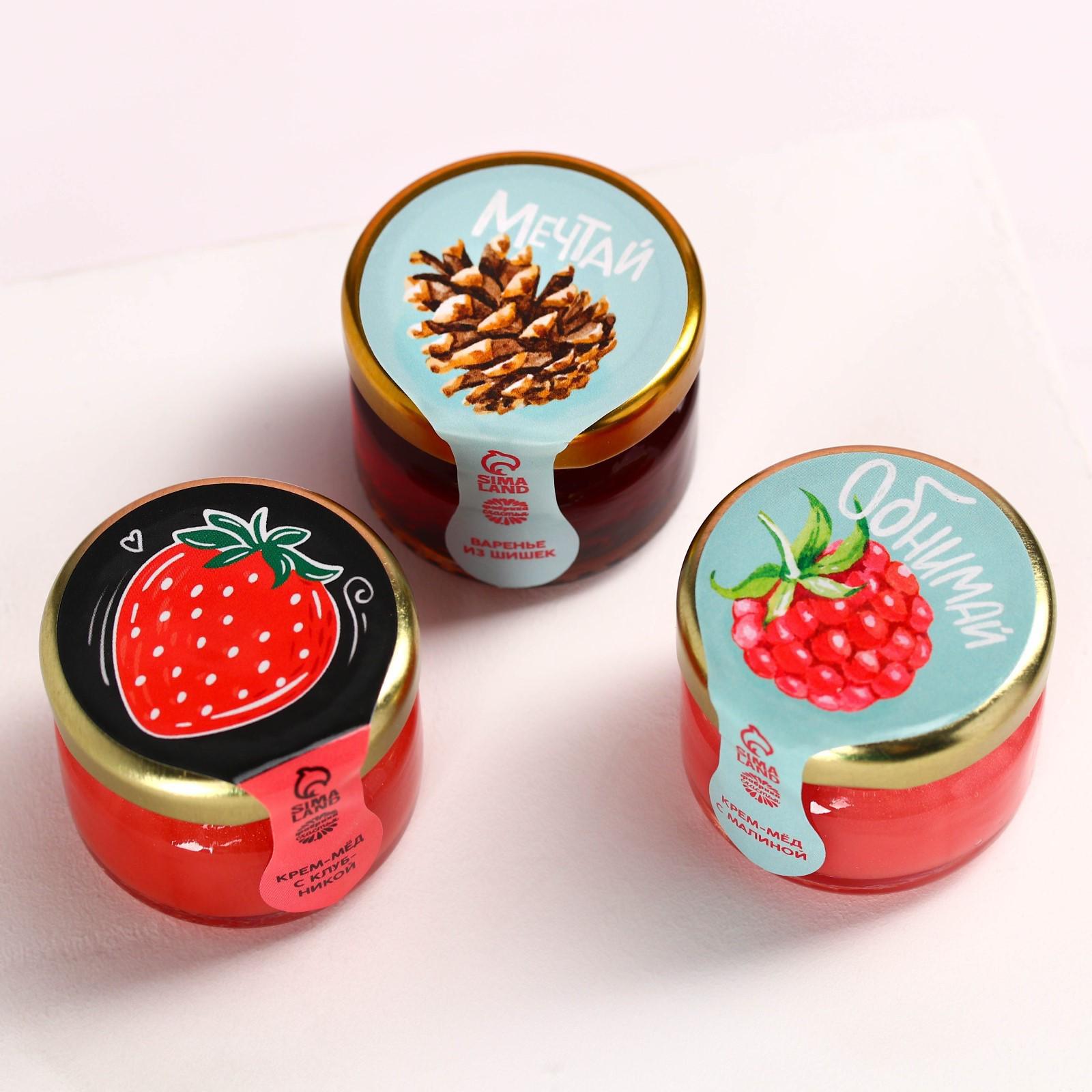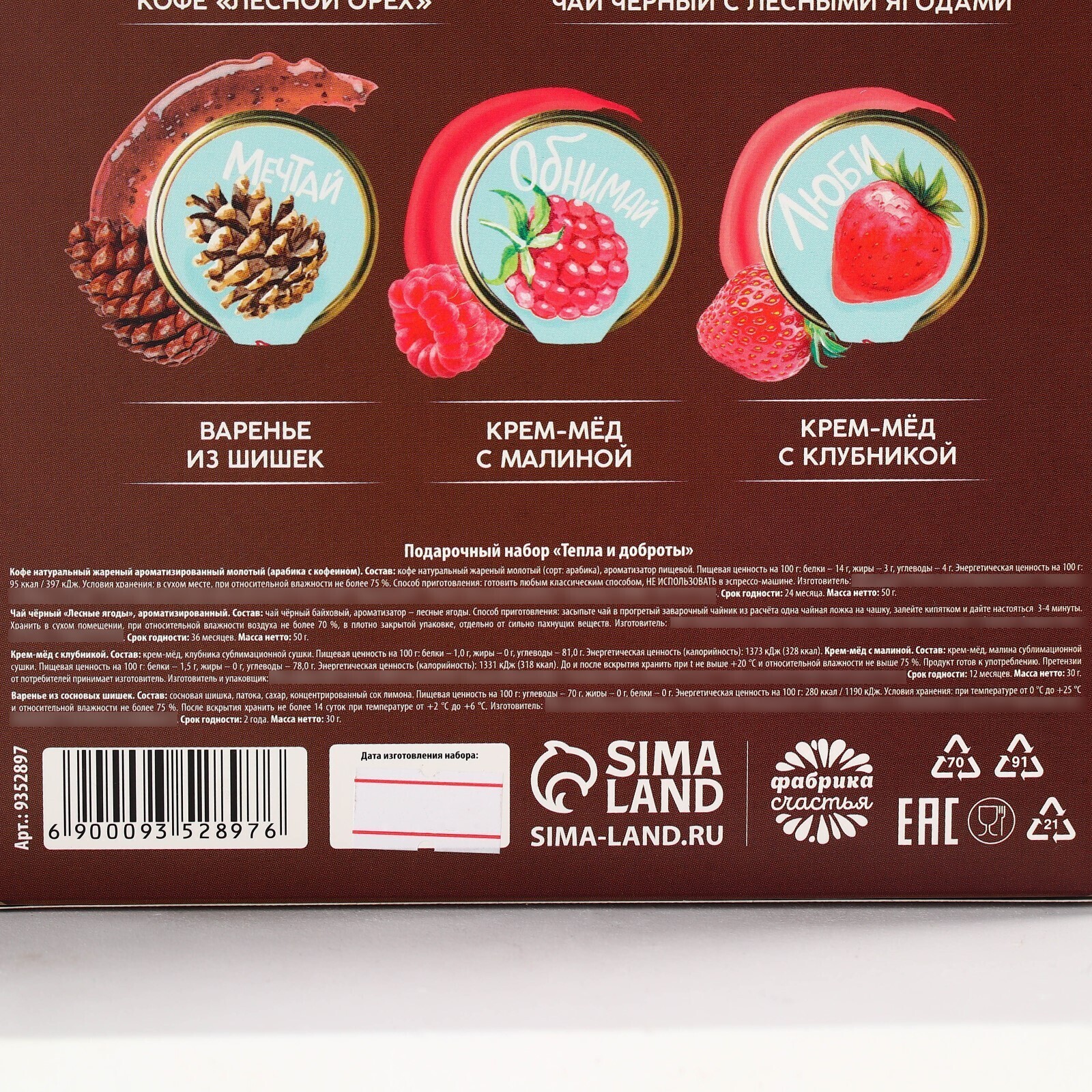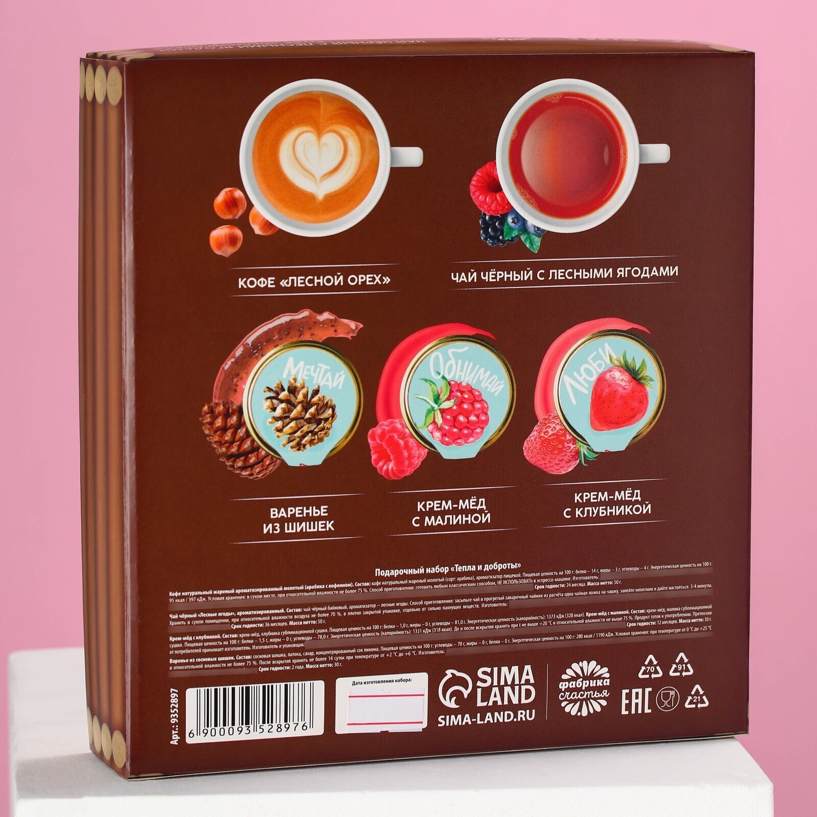 Набор «Тепла и доброты», кофе со вкусом лесного ореха 50 г., чай чёрный со вкусом лесных ягод 50 г., варенье из шишек 30 г., крем-мёд с малиной 30 г., крем-мёд с клубникой 30 г.