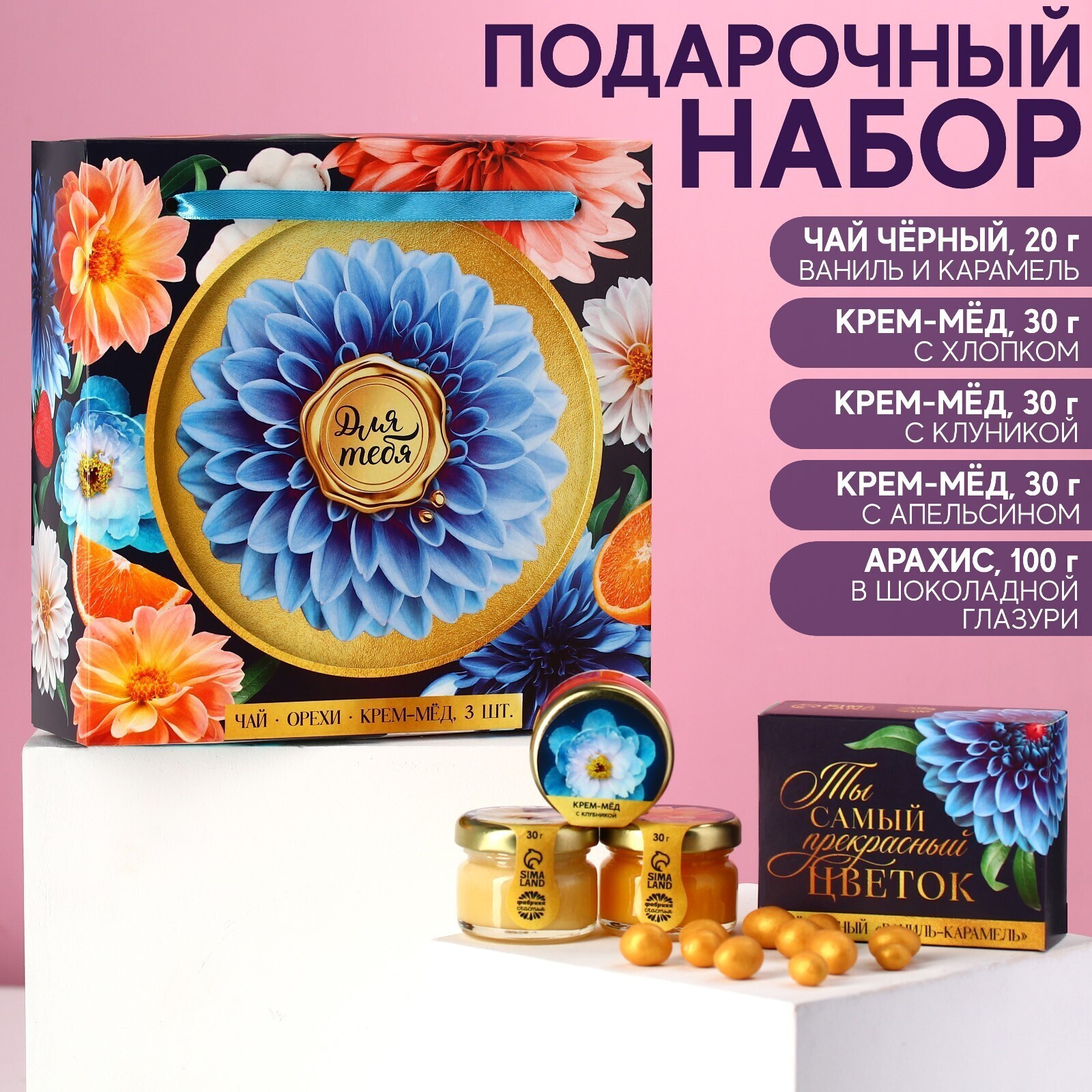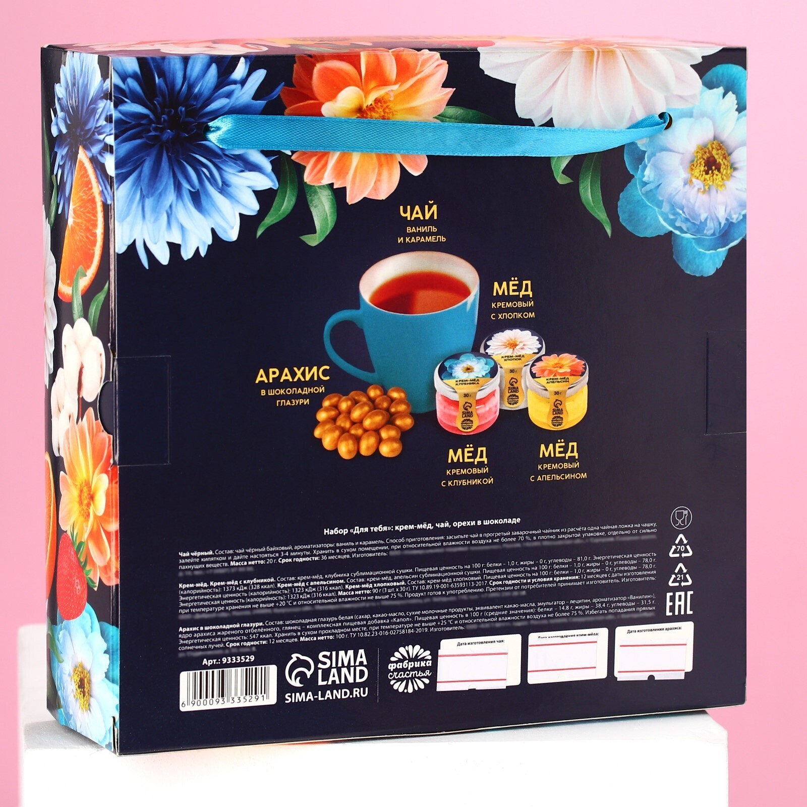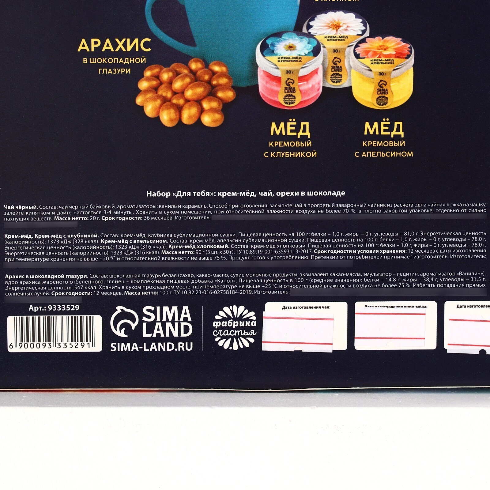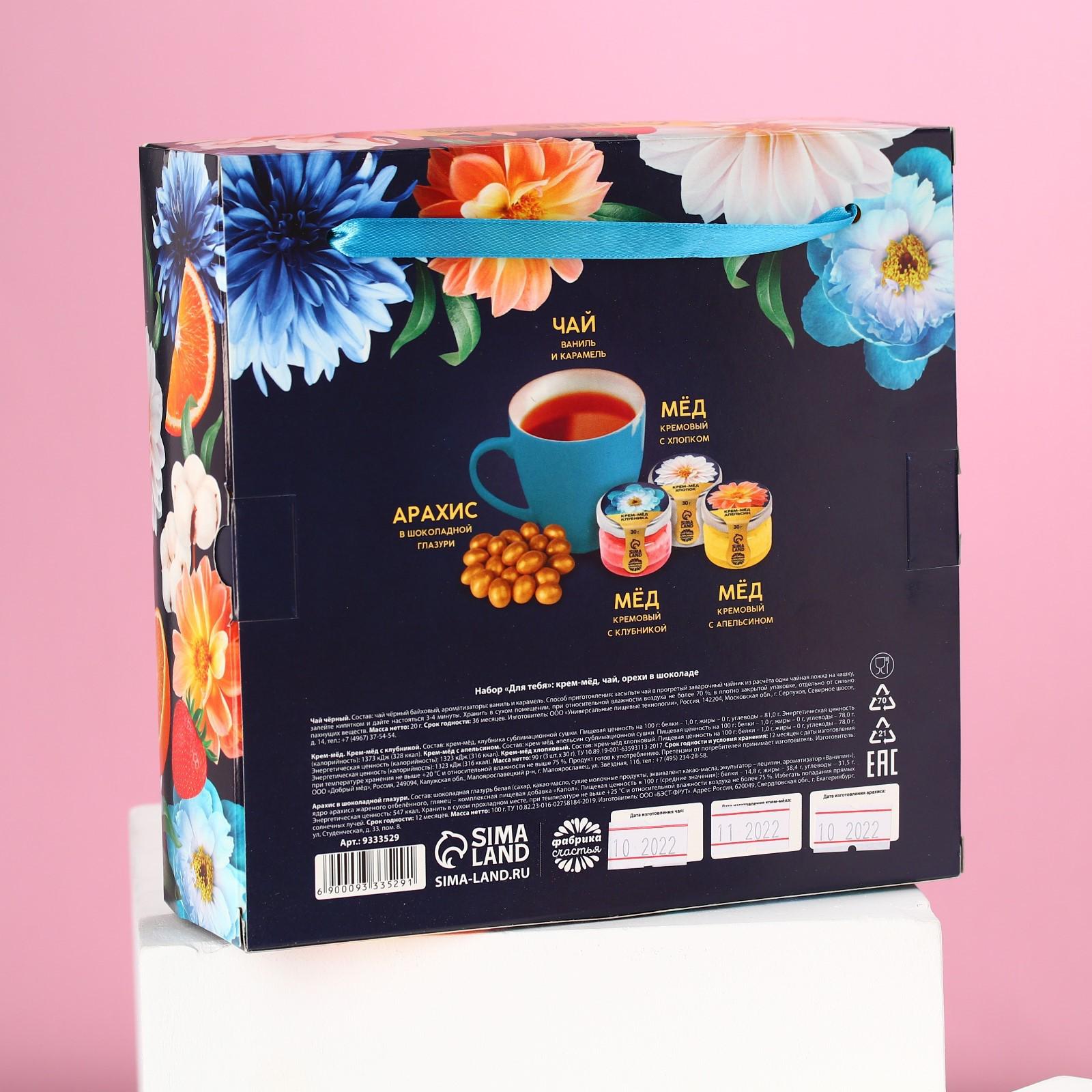 Подарочный набор «Для тебя», чай чёрный 20 г., крем-мёд с клубникой 30 г., крем-мёд с апельсном 30 г., крем-мёд с хлопком 30 г., арахис в глазури 100 г.