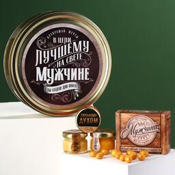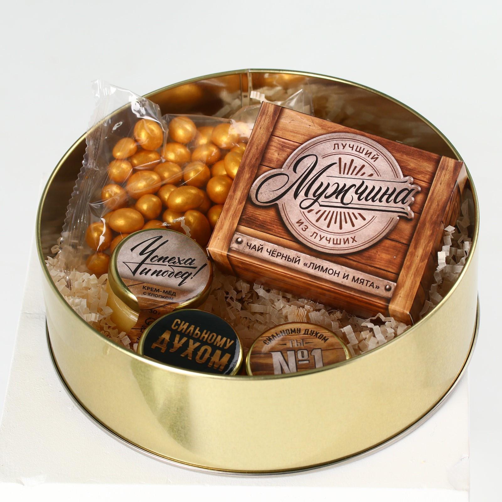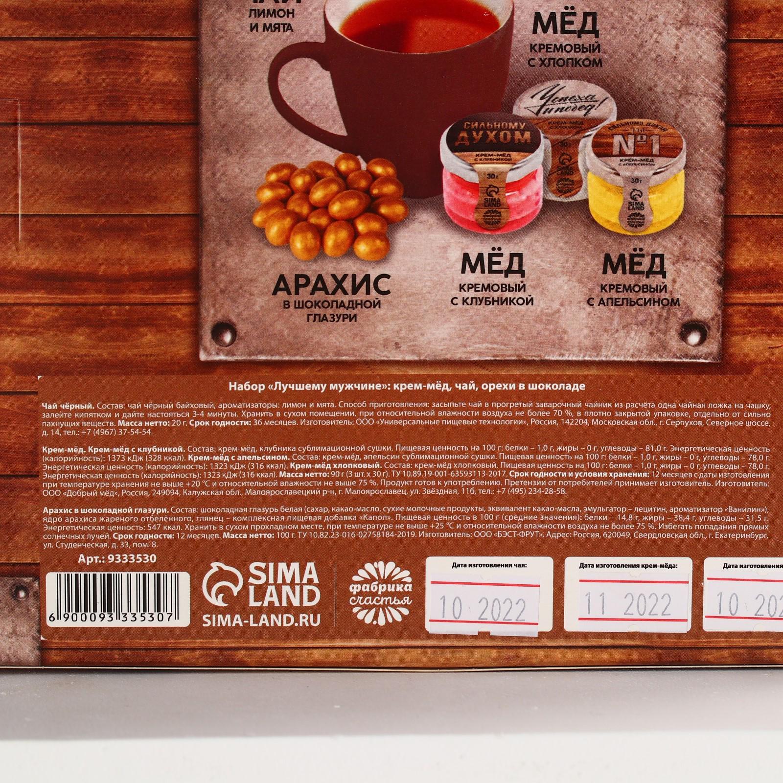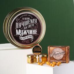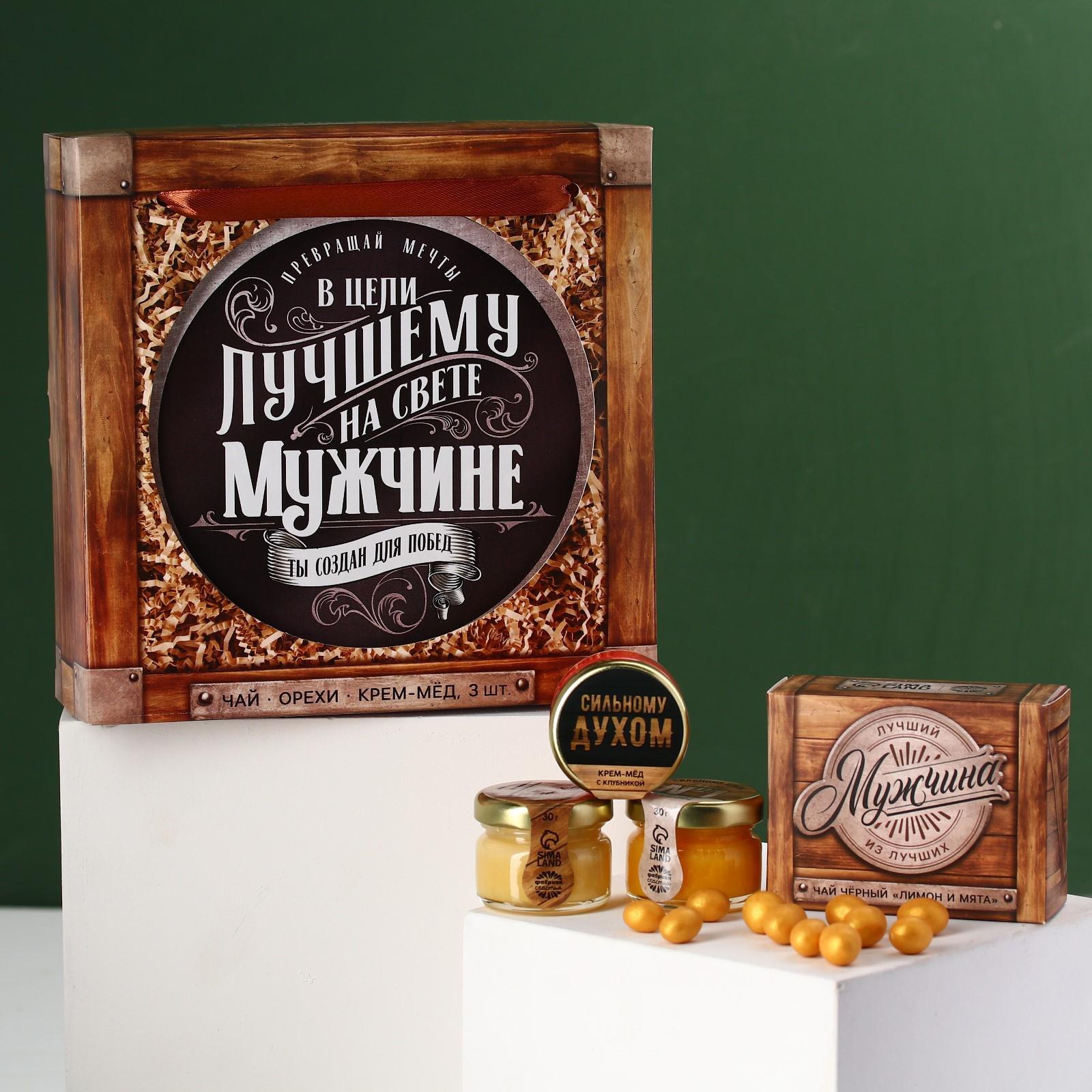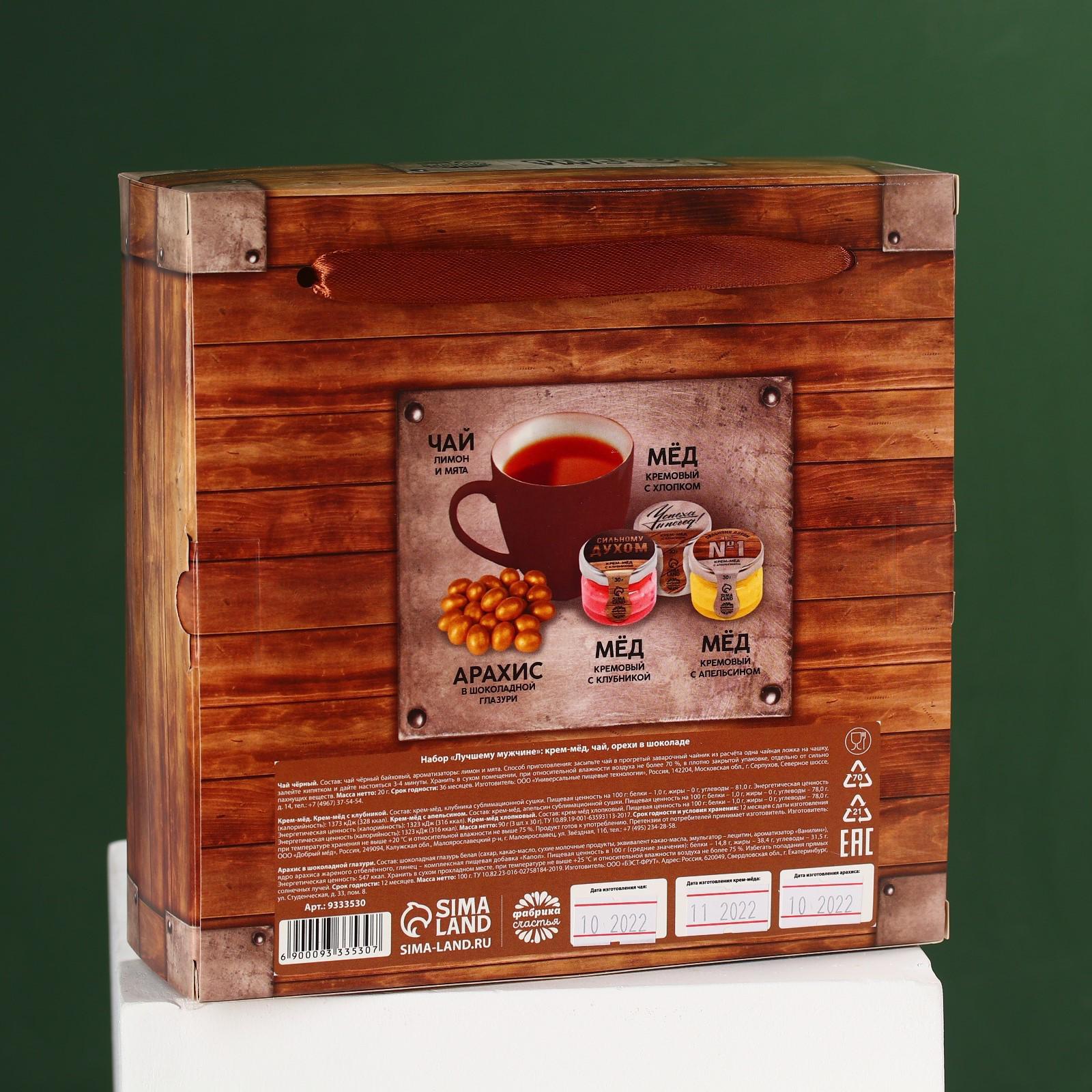 Набор «Лучшему мужчине»,чай чёрный со вкусом лимон и мята 20 г., крем-мёж с клубникой 30 г., крем-мёд с апельсином 30 г., крем-мёд с хлопком 30 г., арахис в глазури 100 г.