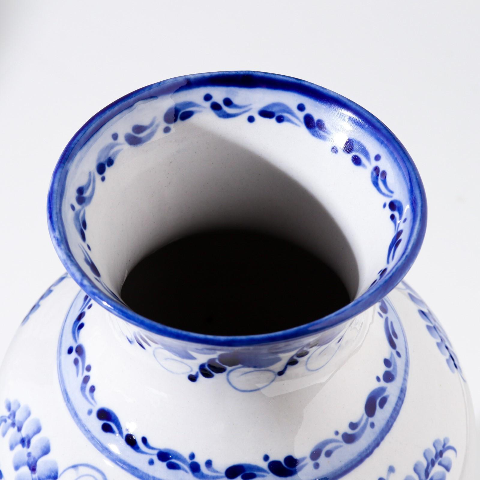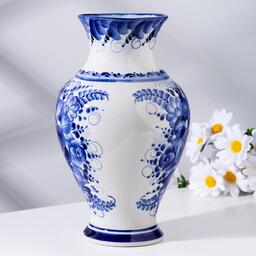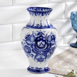 Собственный стиль Гжели — синие и голубые узоры, растительный орнамент и витиеватые украшения на белом фоне. В каждом предмете легко и непринуждённо варьируются букеты и гирлянды, вводятся геометрические пояски, похожие на вязаное кружево, изделия украшает декоративная лепнина, изображаются пейзажные сюжеты.