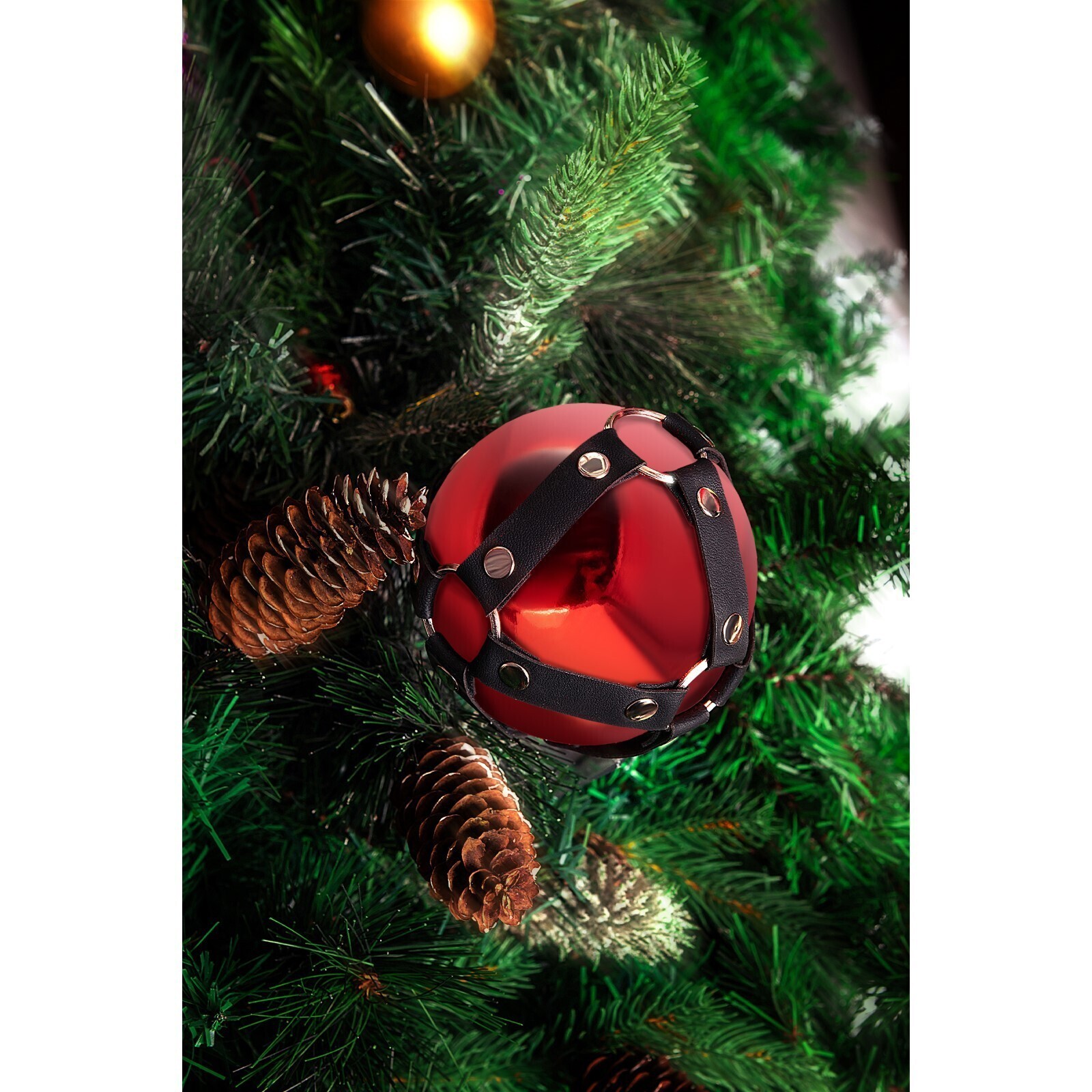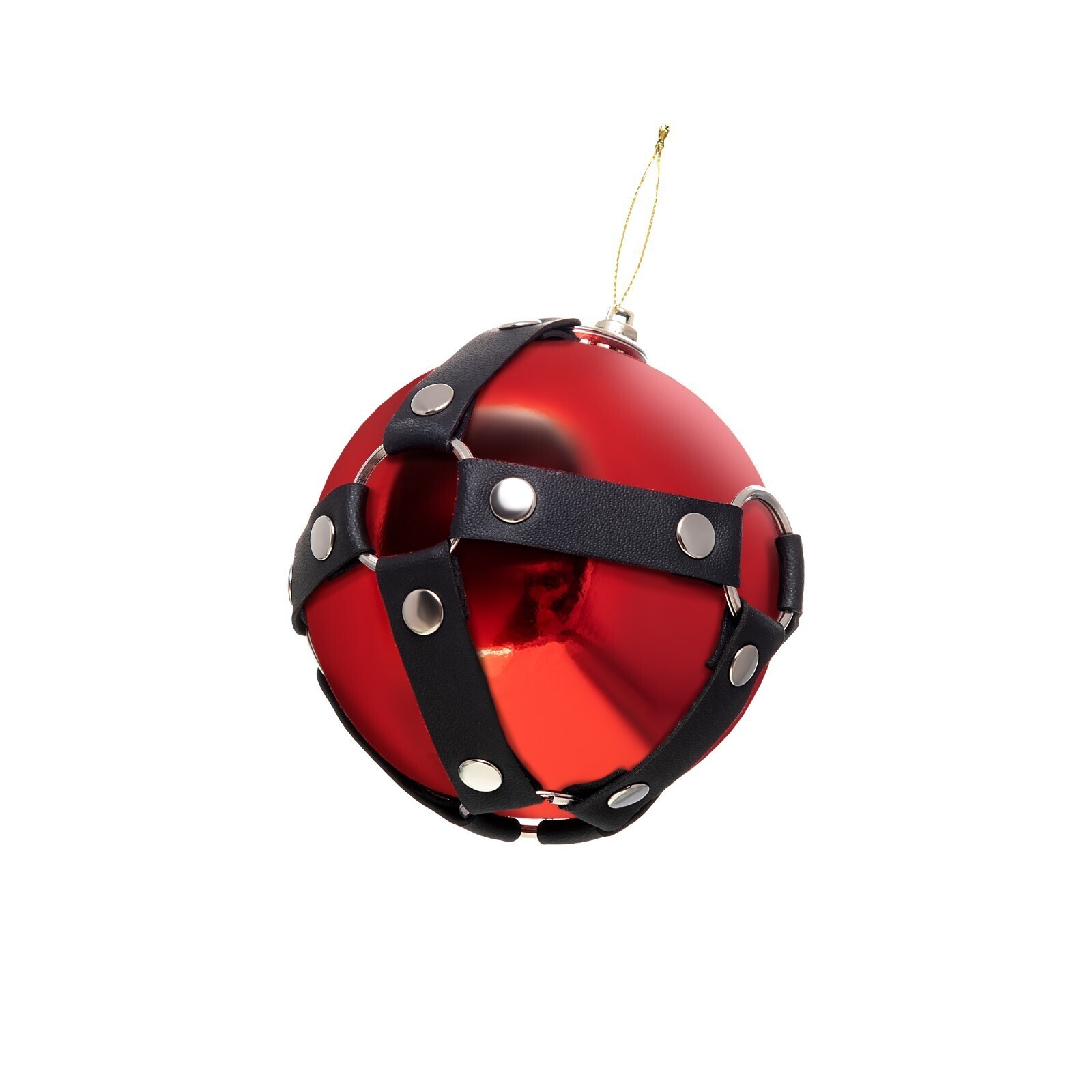 Эта ёлочная игрушка подарит не только новогоднее настроение, но и возбуждающую атмосферу! Глянцевый шар огненно-красного цвета изготовлен из качественного, прочного пластика. Кожаные ремни по всей поверхности выполнены из натурального, экологичного материала. 22 элемента стальной фурнитуры дарят новогоднему украшению манящий эффект.