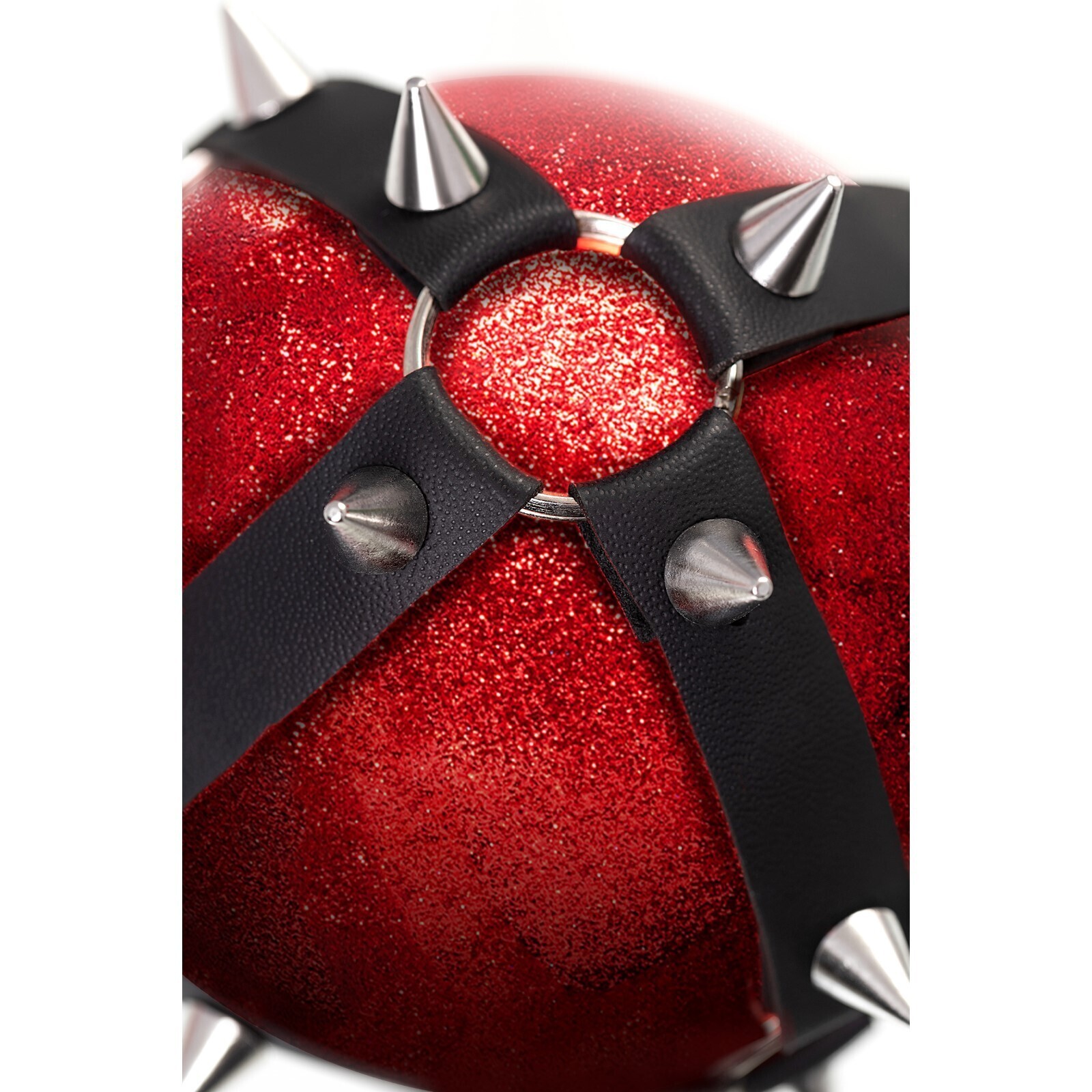 Блестящий прочный шар гранатово-красного цвета изготовлен из качественного пластика. Ремни по всей поверхности выполнены из натуральной, экологичной кожи. 22 элемента металлической фурнитуры окунают в атмосферу господства и повиновения.