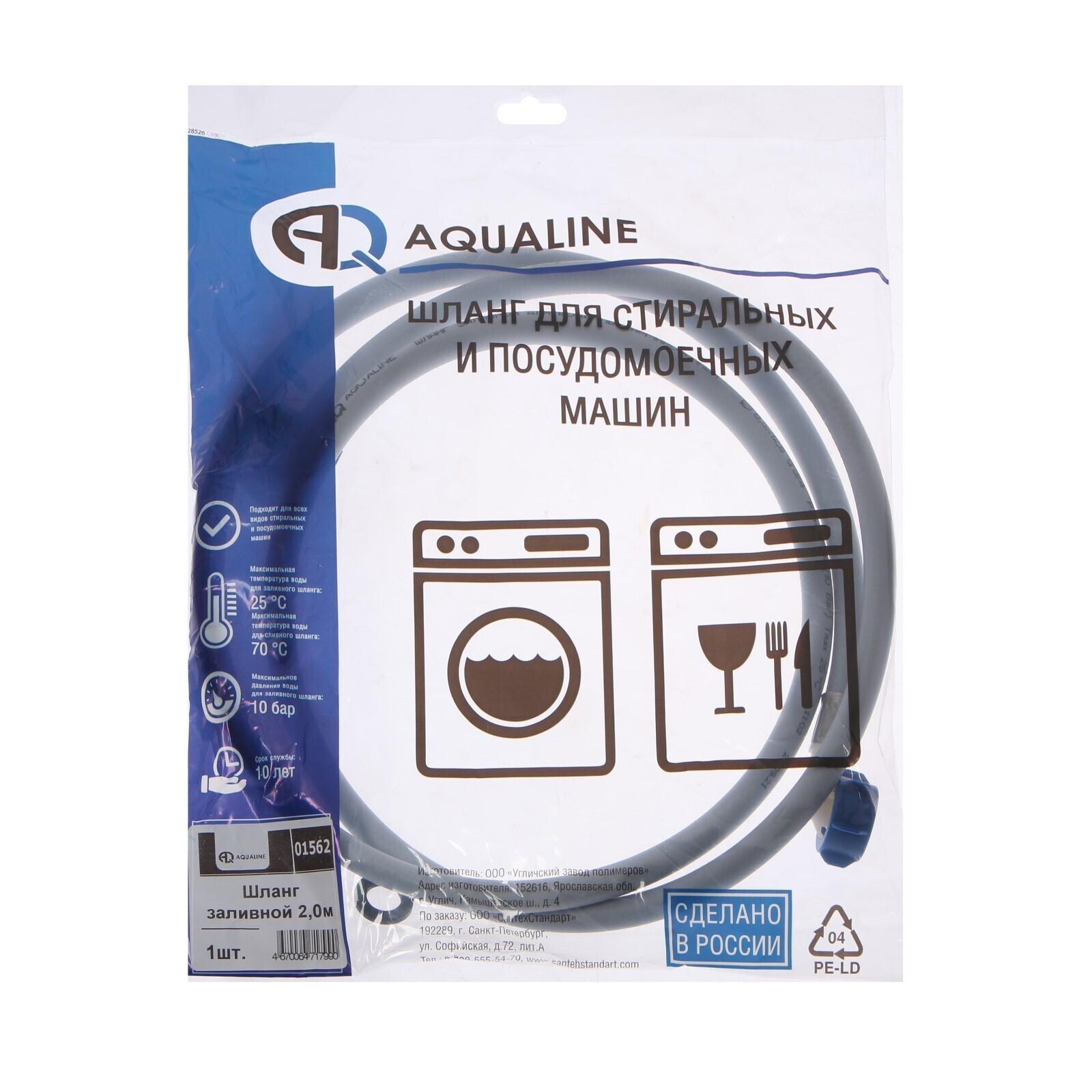 Заливной шланг для стиральной машины AQUALINE 1562, индивидуальная упаковка, 2 м