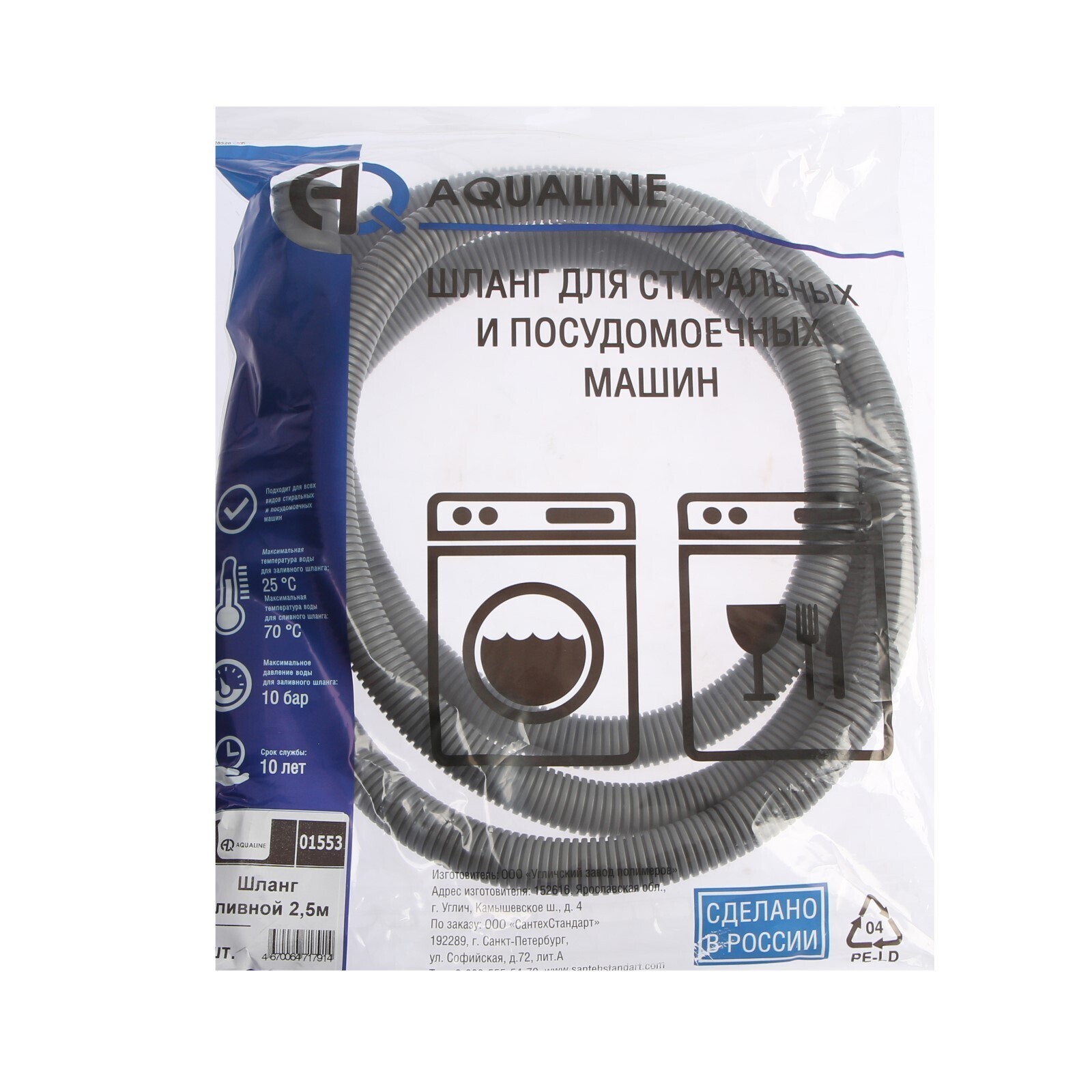Сливной шланг для стиральной машины AQUALINE 1553, индивидуальная упаковка, 2.5 м