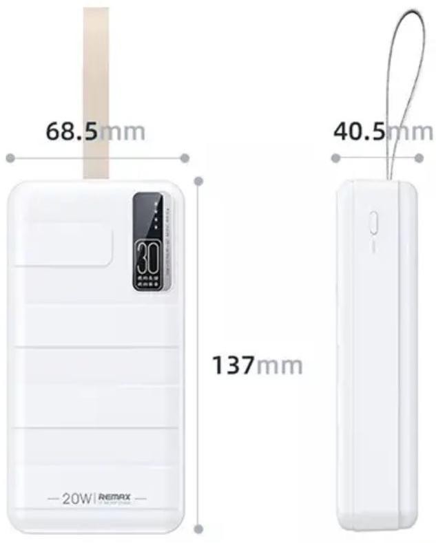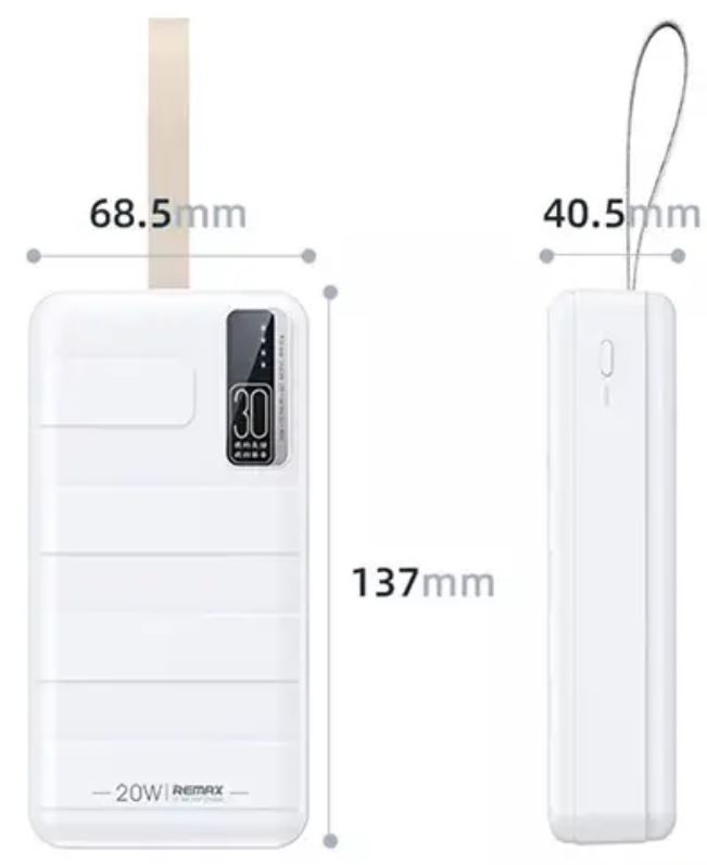Remax RPP-506 зроблений з якісних та міцних матеріалів: пластику та полікарбонату, стійкого до впливу високих температур. Незважаючи на значний запас енергії, зосереджений усередині, у повербанка компактні габарити: розмір – 137×68.5×40.5 мм, а вага – 585 грамів. Він міститься в долоні і важкий для своєї ємності.