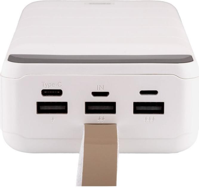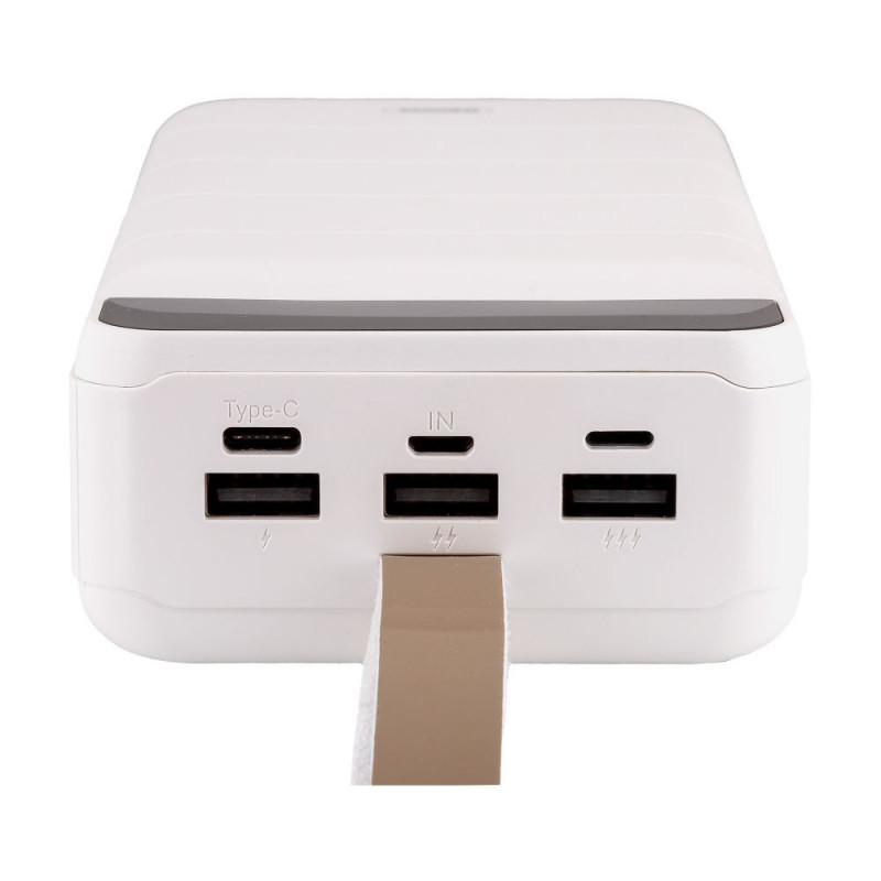 REMAX Leader Series 2.1A Fast Charging Power Bank 50000mAh RPP-185 White – високоякісний портативний зарядний пристрій із ємною батареєю, який стане чудовим вибором для заряджання гаджетів під час відпочинку на природі або тривалих поїздок. Корпус повербанку надійно зібраний, виготовлений із міцного поєднання вогнестійкого полікарбонату та ABS пластику. У верхній частині передньої панелі аксесуара розташований LED дисплей, захищений чорною глянсовою накладкою та відображає рівень його заряду у відсотках. На бічній грані аксесуара знаходиться кнопка управління, а в торці - роз'єм Micro-USB, Lightning і Type-C для його заряджання і три USB порти для заряджання різних гаджетів.