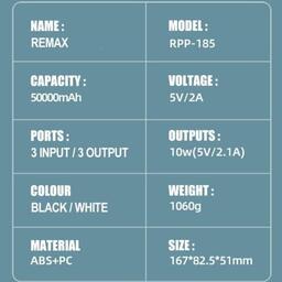Ємність - 50000 mAh, потужність – 10Вт ,електрохімічна система - Li-pol, джерело заряду вбудованої батареї - USB, інтерфейси підключення (вихід) - 3 х USB, матеріал корпусу - пластик, вага - 1060 г, Колір - білий