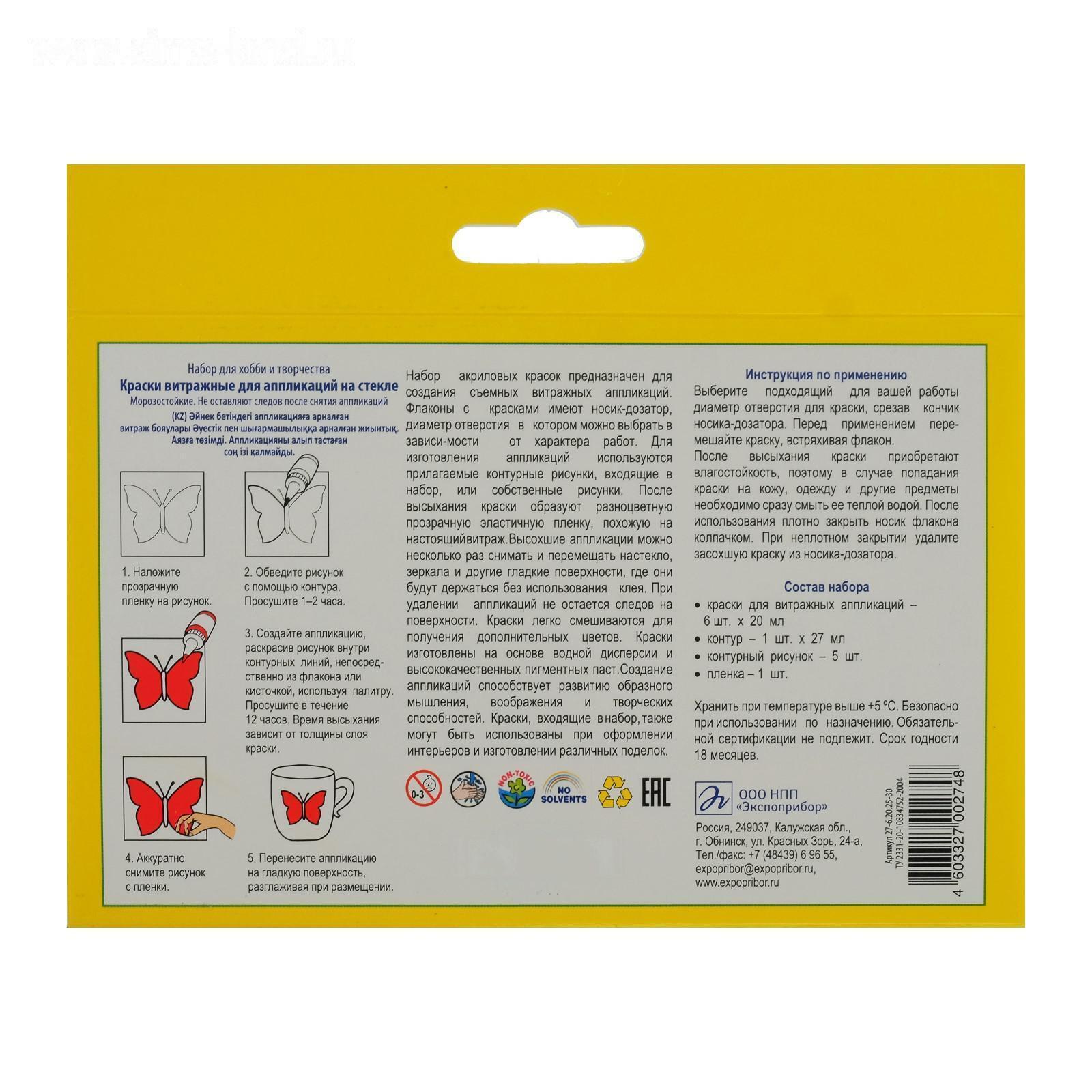 Краски предназначены для создания съемных витражных аппликаций. Флаконы с красками имеют носик-дозатор, диаметр отверстия в котором можно выбрать в зависимости от характера работы. Для изготовления аппликаций используются прилагаемые контурные рисунки, входящие в набор, или собственные рисунки.