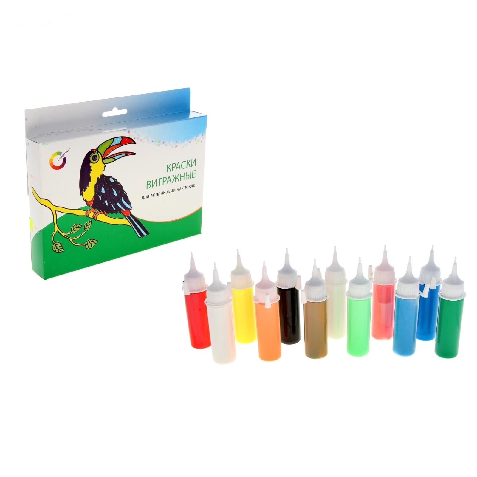Краски предназначены для создания съемных витражных аппликаций. Состав набора :Коробка с подвесом -1 шт., внутренняя коробка – 1 шт., полиэтиленовая пленка (пакетик), контурные рисунки – 5 шт., советы для начинающих – 1 шт.Состав: 12 флаконов.