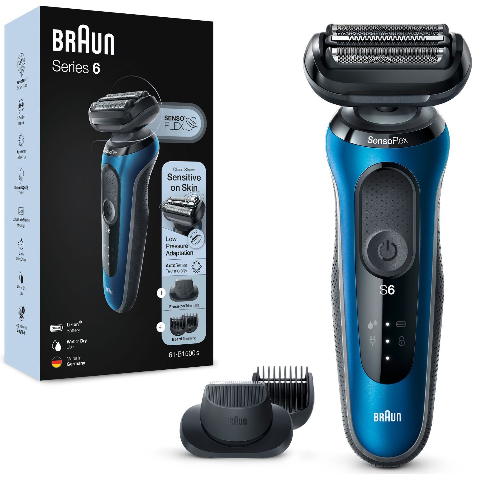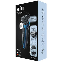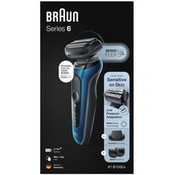 Braun Series 6 61-B1500s BLUE/BLACK - точність та комфорт для шкіри: дерматологічно протестована поворотна головка SensoFlex та леза SensoFoil призначені для мінімізації тиску на чутливу шкіру. Ефективний навіть при жорсткій щетині: технологія AutoSense аналізує щетину та регулює потужність залежно від її густоти, захоплюючи та підрівнюючи більше волосся при кожному голінні. У комплект входить насадка для тримера 0,5-7 мм.
