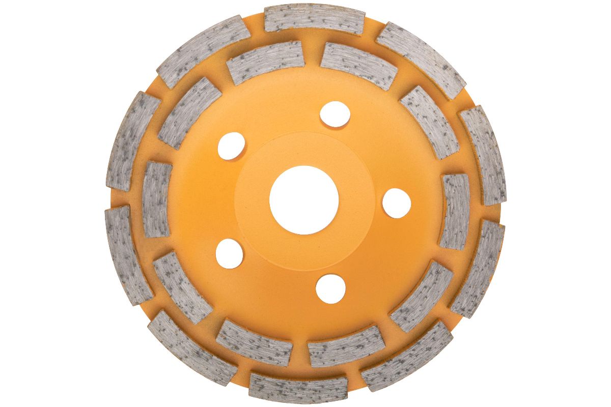 2 ряда сегментов. Для углошлифовальных машин. Посадочный диаметр 22 мм. Удобен для выравнивания кромки, шлифовки, полировки и работ, где необходима тонкая обработка. Работает по бетону, граниту, мрамору и другим материалам.