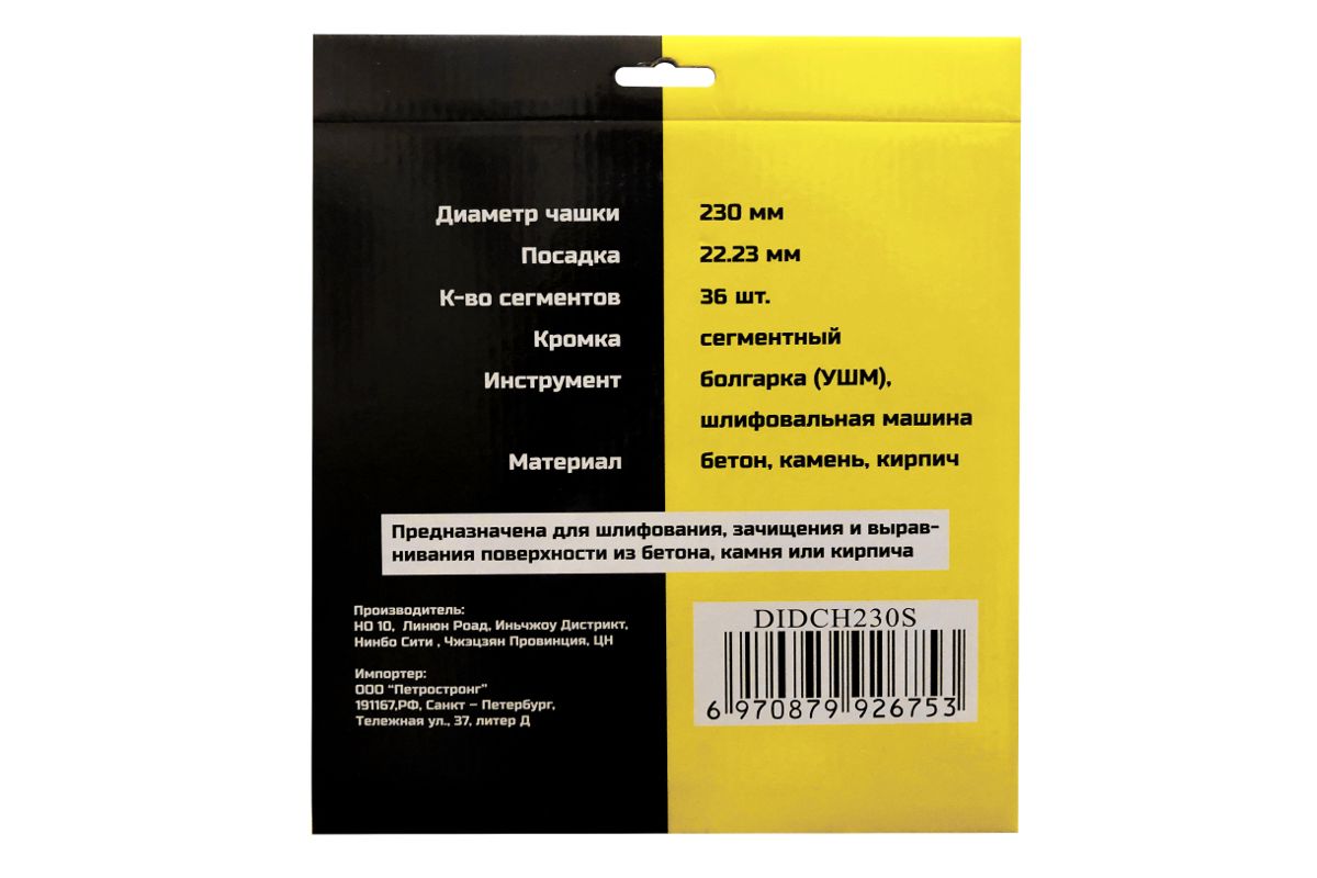 Высота алмазного сегмента 6 мм, диаметр чашки 230 мм, посадочное отверстие 22,23 мм.