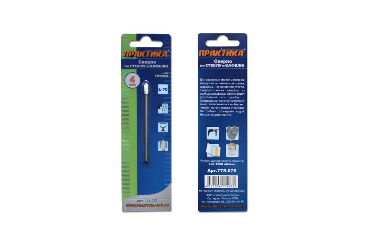 Сверло по стеклу и кафелю ПРАКТИКА 775-075 4х70мм, V-тип