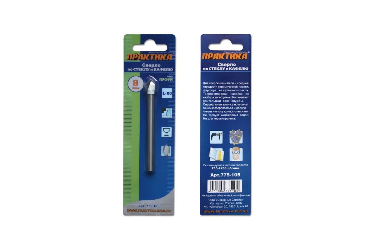 Сверло по стеклу и кафелю ПРАКТИКА 775-105 8х80мм, V-тип