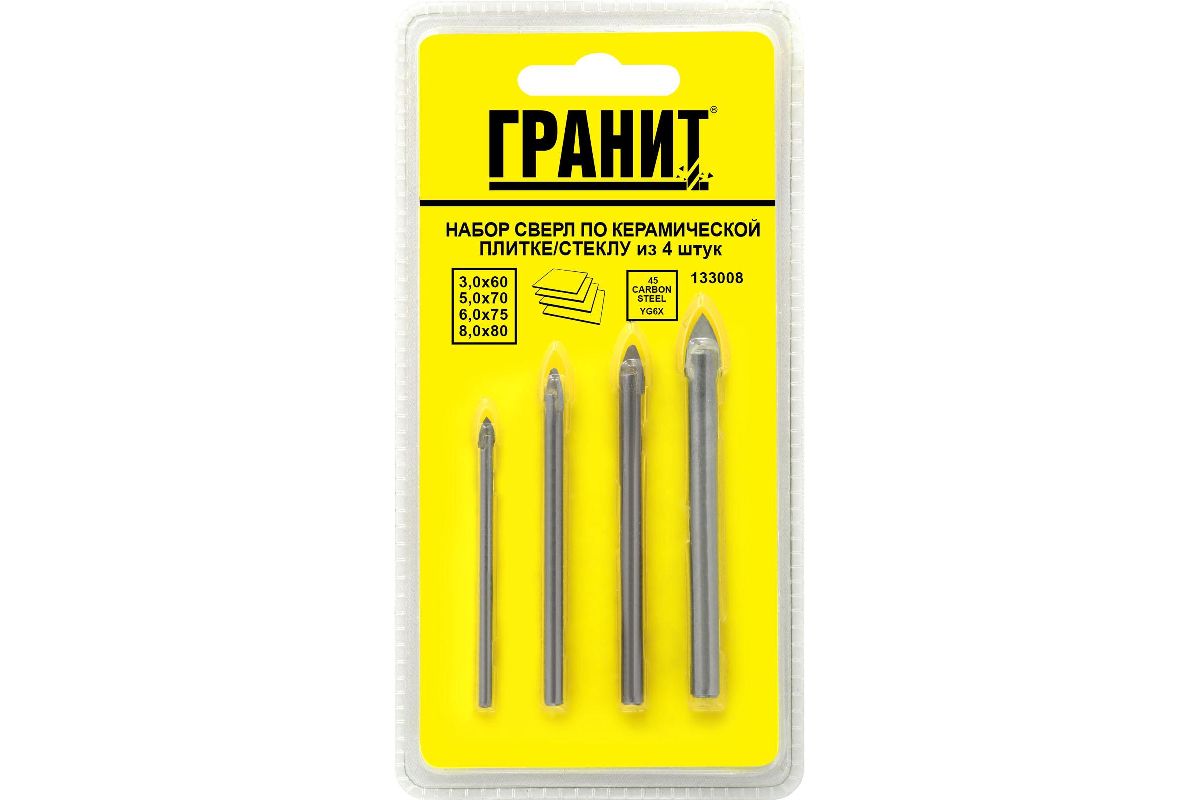 Набор сверл ГРАНИТ 133008 по керамике и стеклу 4 шт. (3, 5, 6, 8 мм)