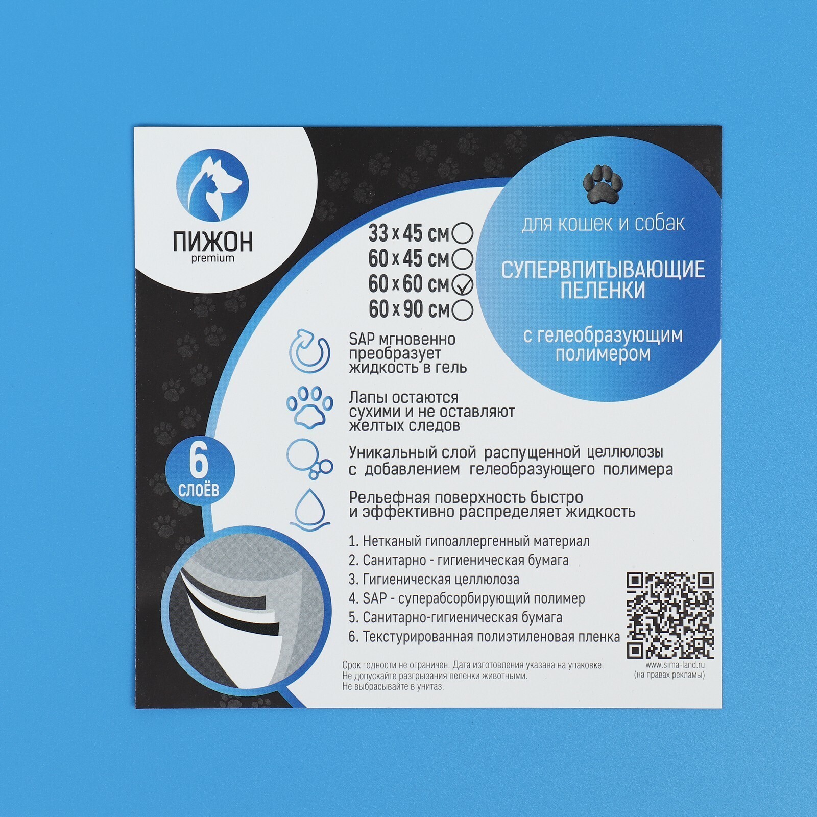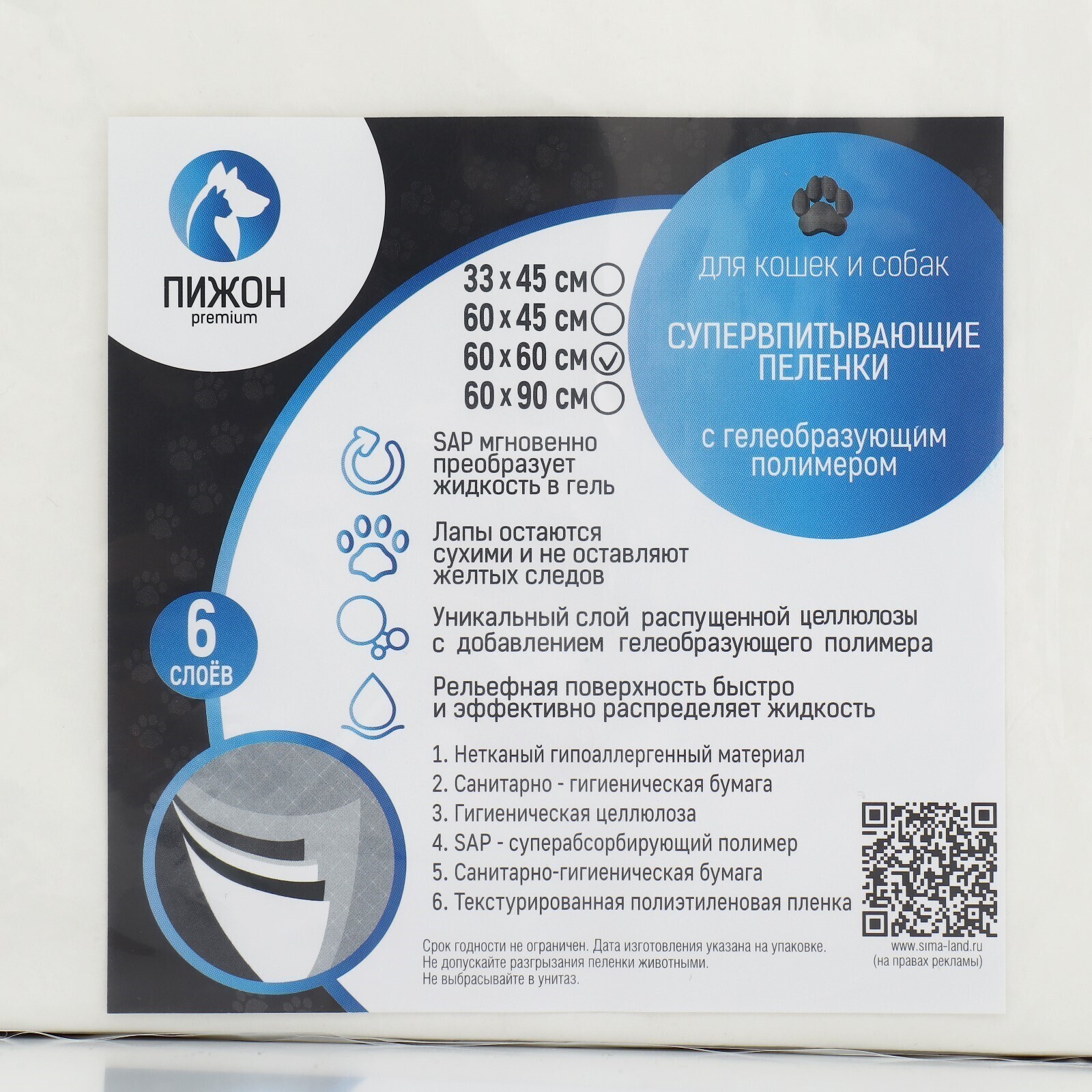 Пеленки шестислойные гелевые для животных, 60 х 60 см, 30 шт