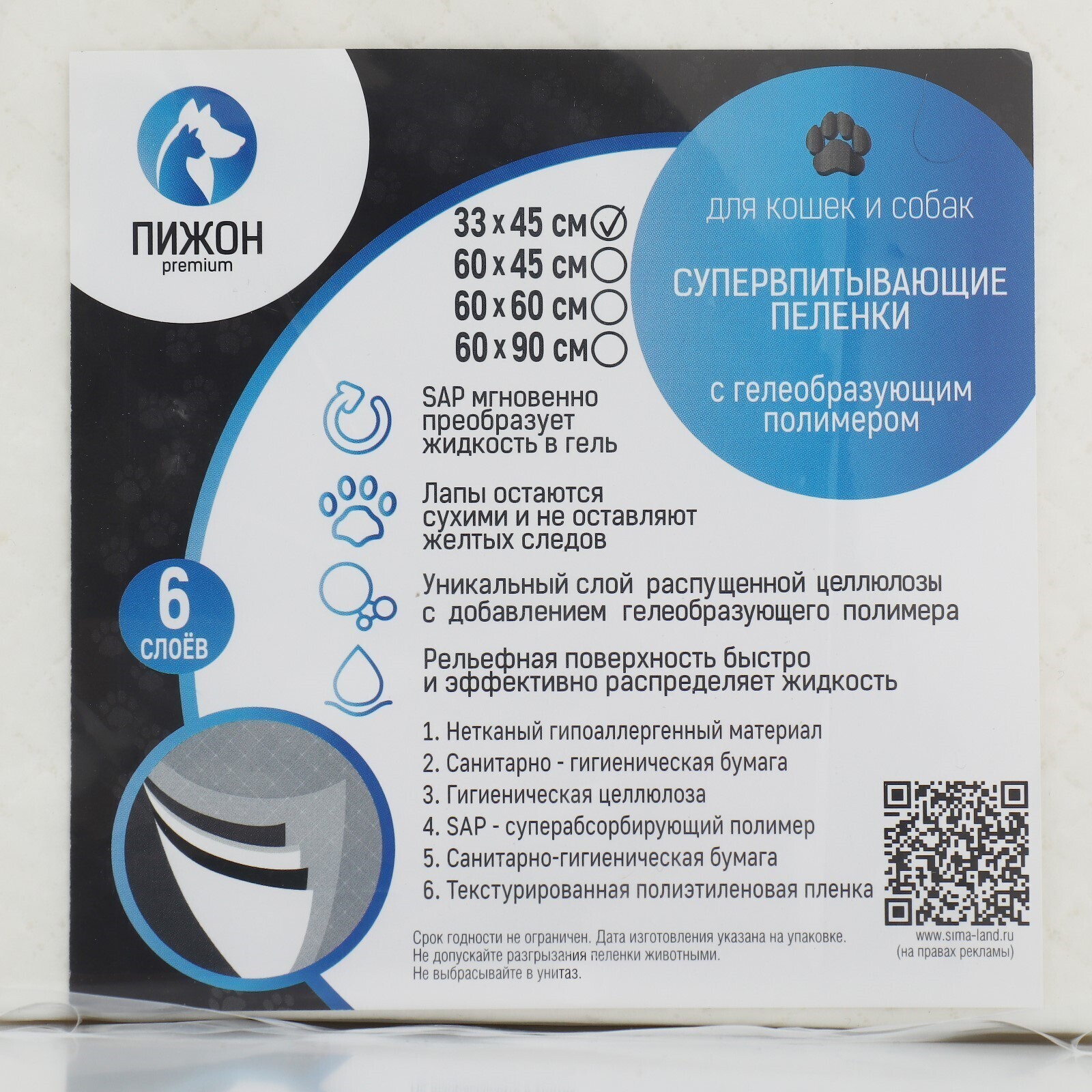 Пеленки шестислойные гелевые для животных, 33 х 45 см, 10 шт