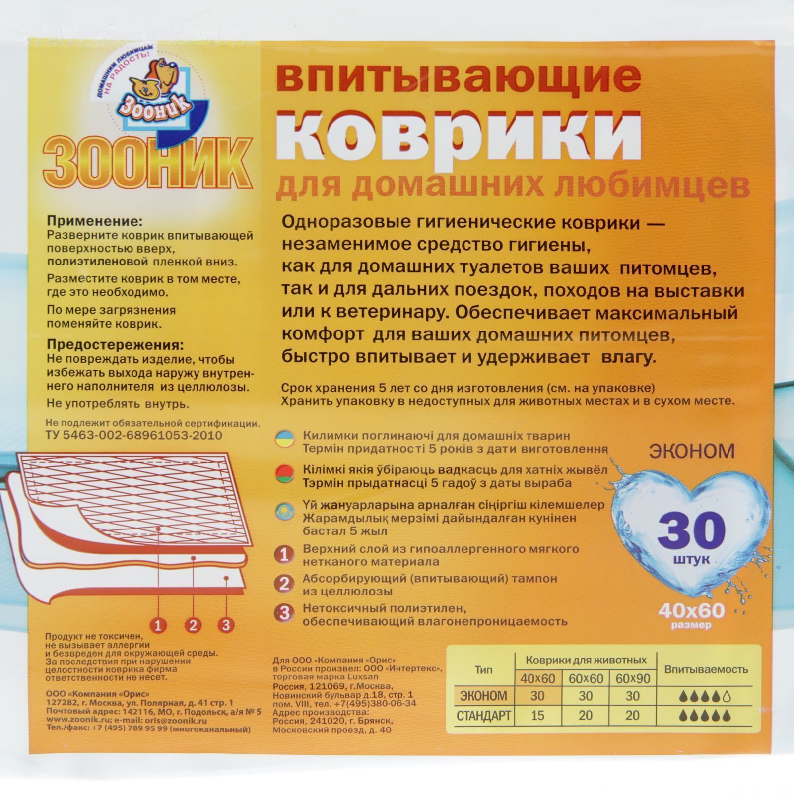 Коврики впитывающие Зооник, 40 х 60 см, 30 шт