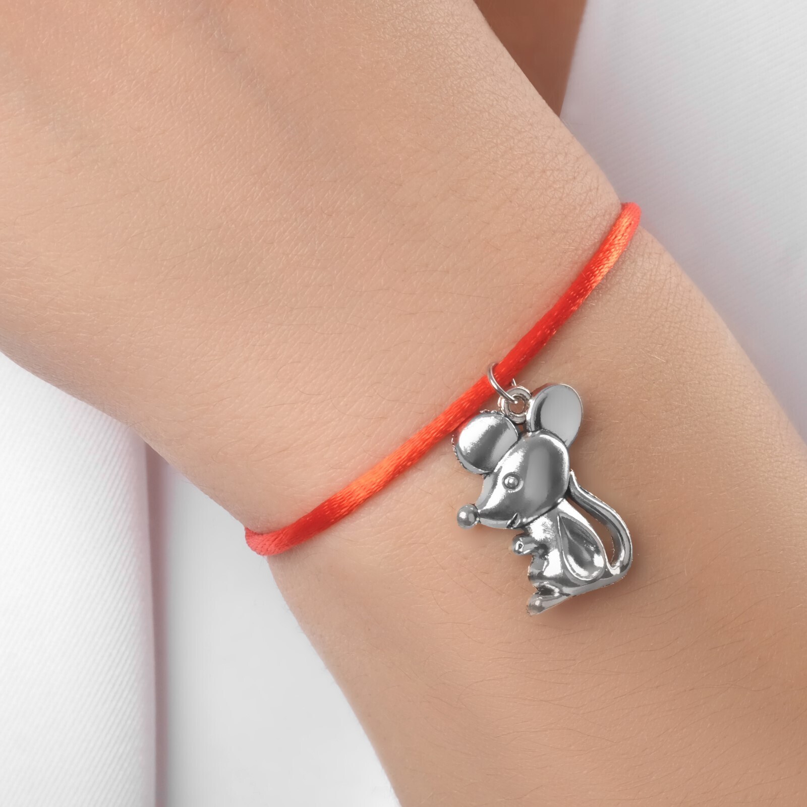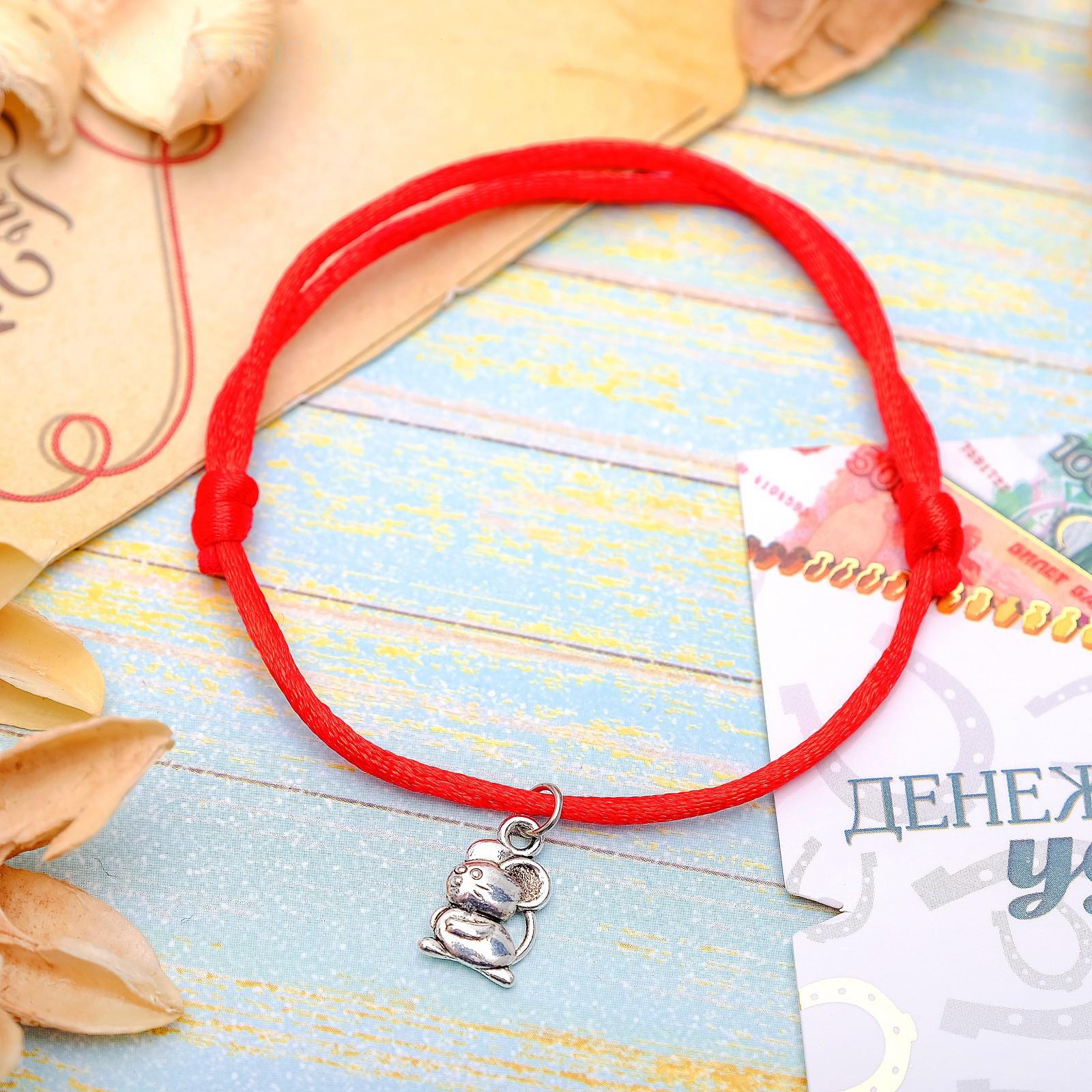 Браслет-оберег "Красная нить" денежная мышка, цвет чернёное серебро, d=8 см