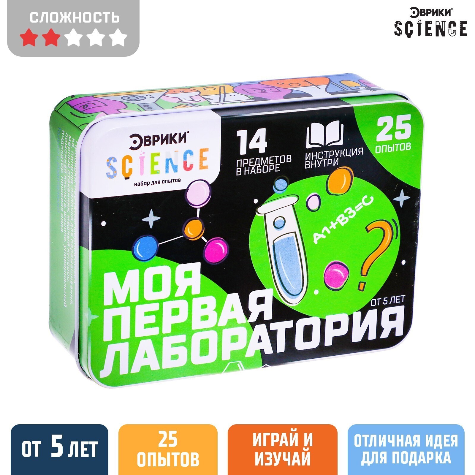 Яркая и удобная металлическая упаковка позволит переносить мини-лабораторию и проводить опыты в любых условиях!