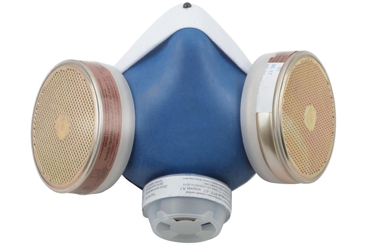 Состоит из резиновой полумаски, двух фильтрующих патронов, пластмассовых манжет с клапанами вдоха, клапана выдоха с предохранительным экраном и оголовья.