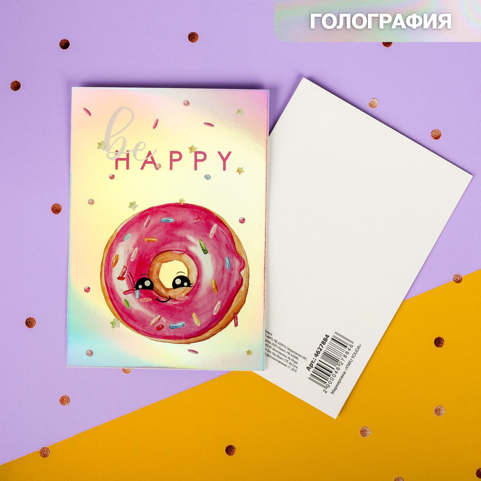 Открытка-валентинка с голографией Be happy, пончик, 7,5 х 10 см