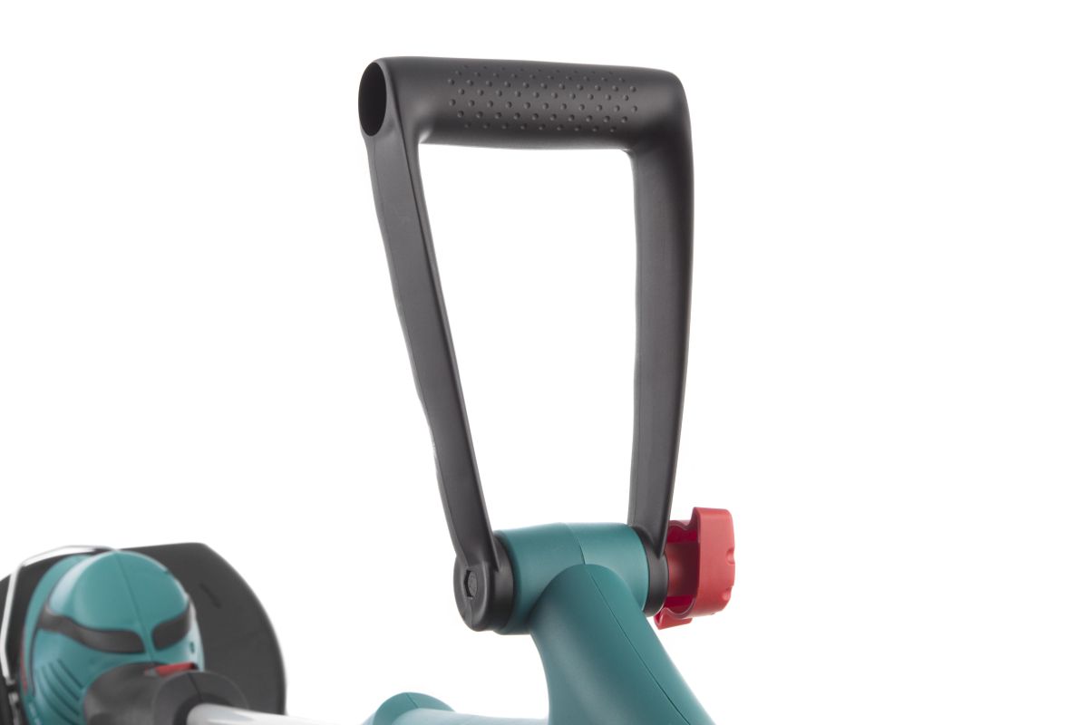 Откидная скоба над двигателем предотвращает повреждения деревьев, оград и бордюров леской.