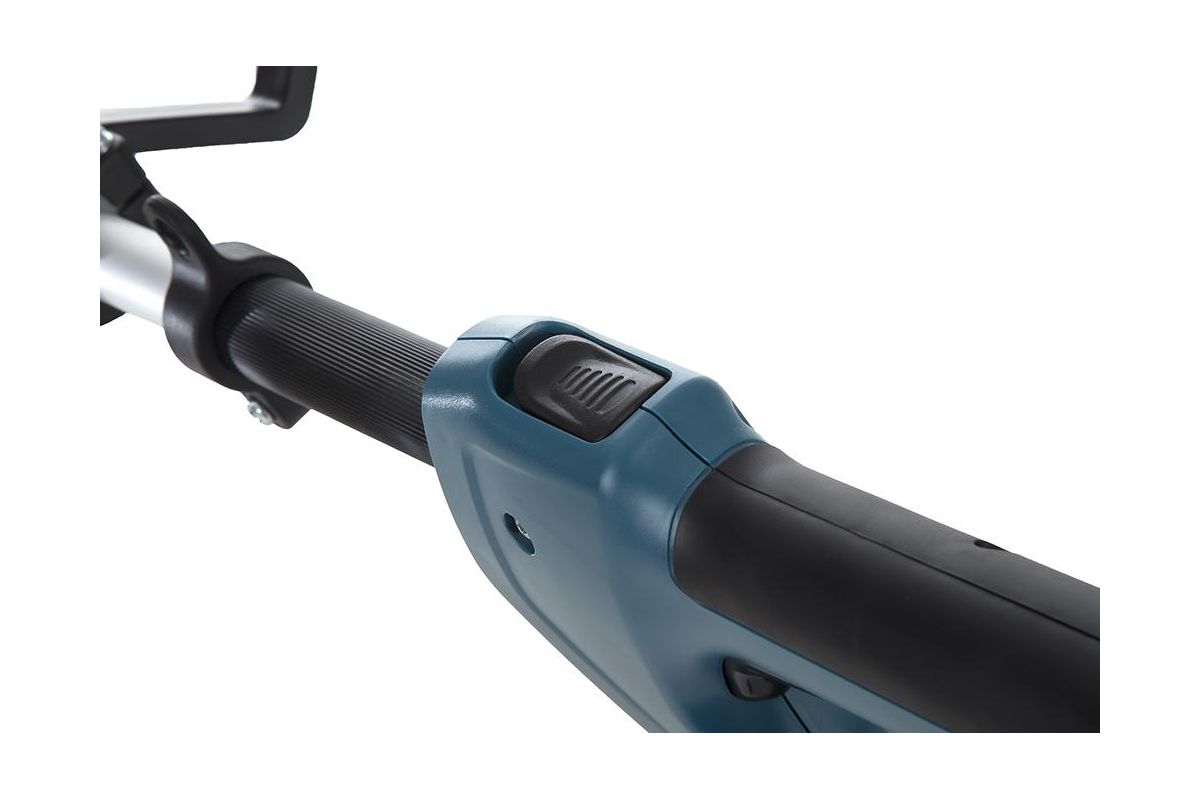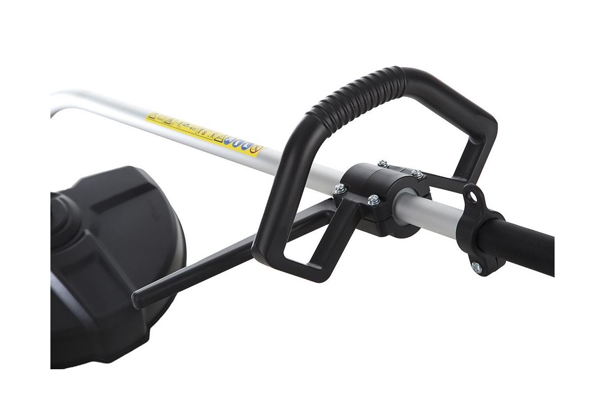 Благодаря D-образной рукоятке электрокосу удобно держать двумя руками. Дополнительная рукоятка свободно перемещается по штанге, её можно настроить под свой рост. Наплечный ремень позволяет снизить нагрузку на руки.