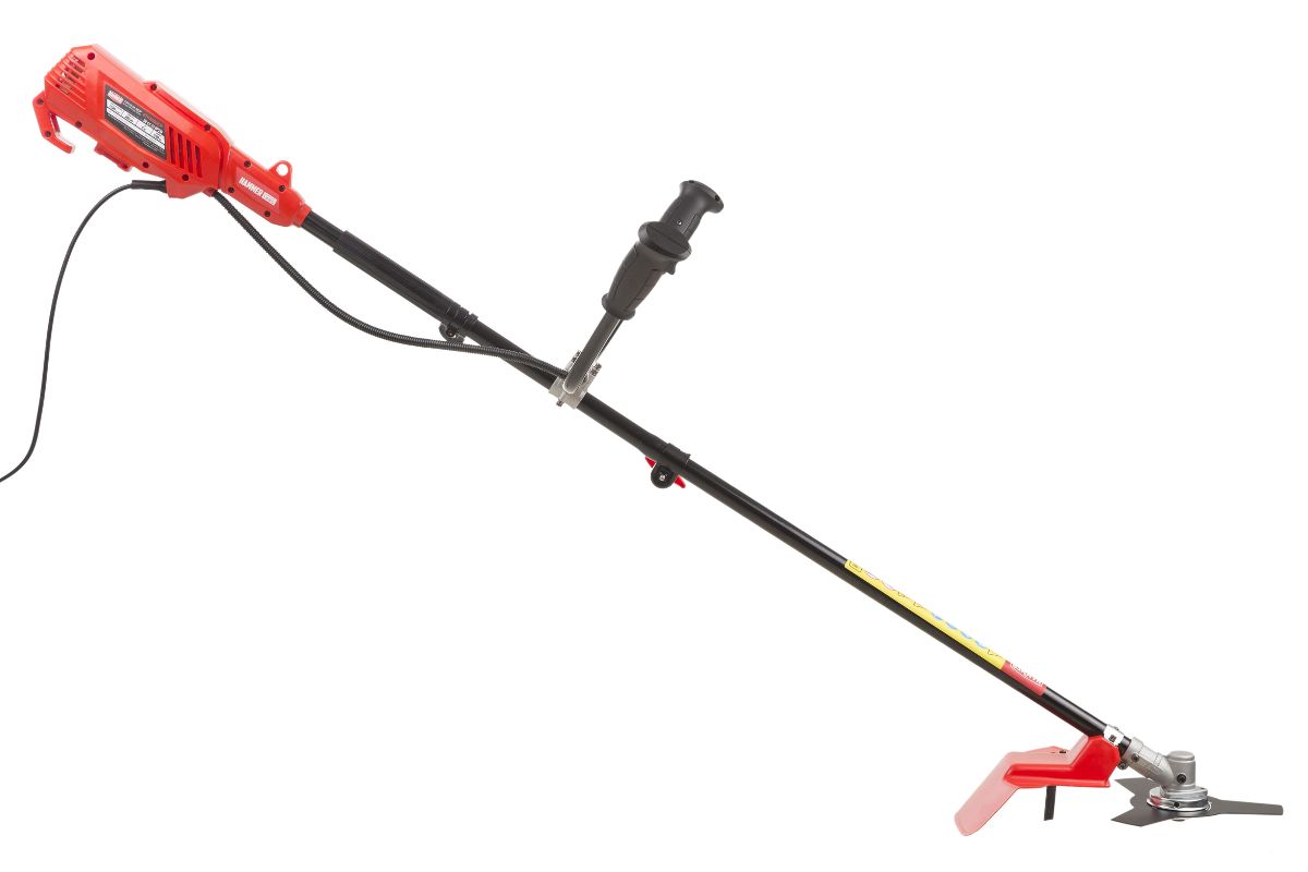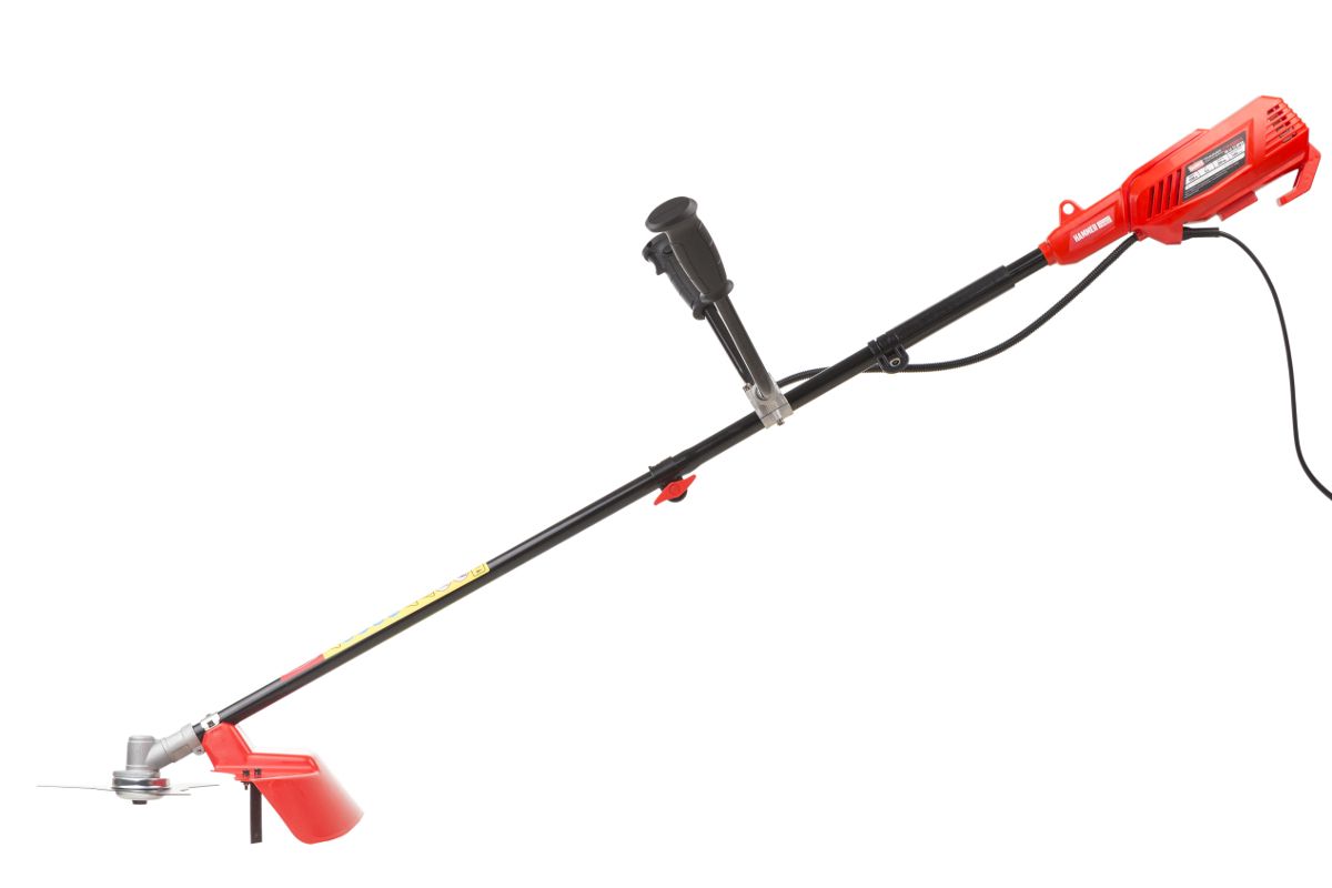Мощный триммер с удобной велосипедной ручкой для ухода за большими участками, подстригания густой травы и мелких кустарников.