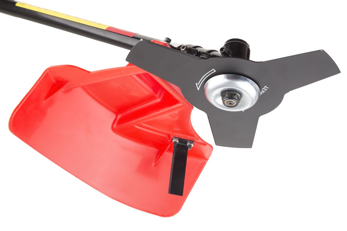 — Трехлопастной металлический нож в комплекте — триммер справится со стрижкой сухостоя и мелкого кустарника;