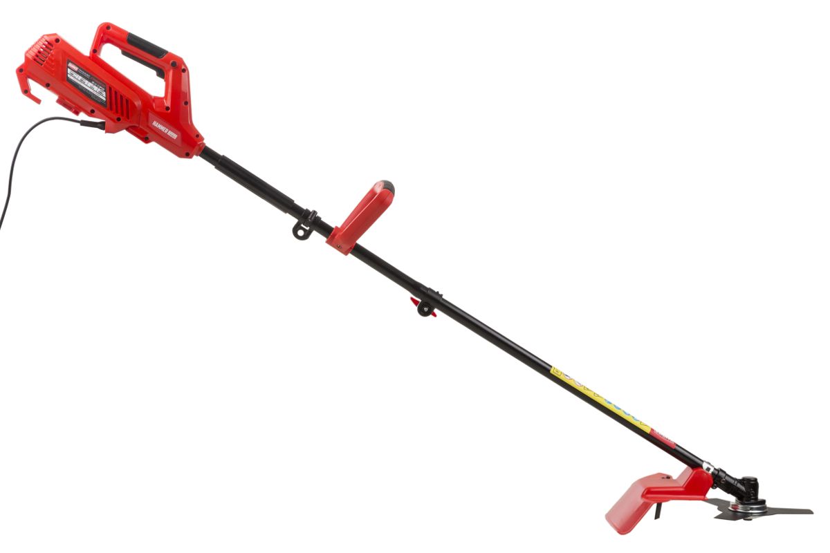 — Трехлопастной металлический нож в комплекте — триммер справится со стрижкой сухостоя и мелкого кустарника;
