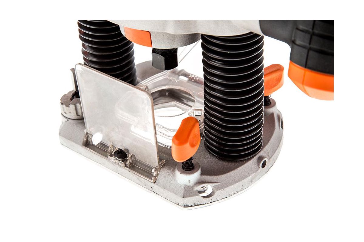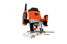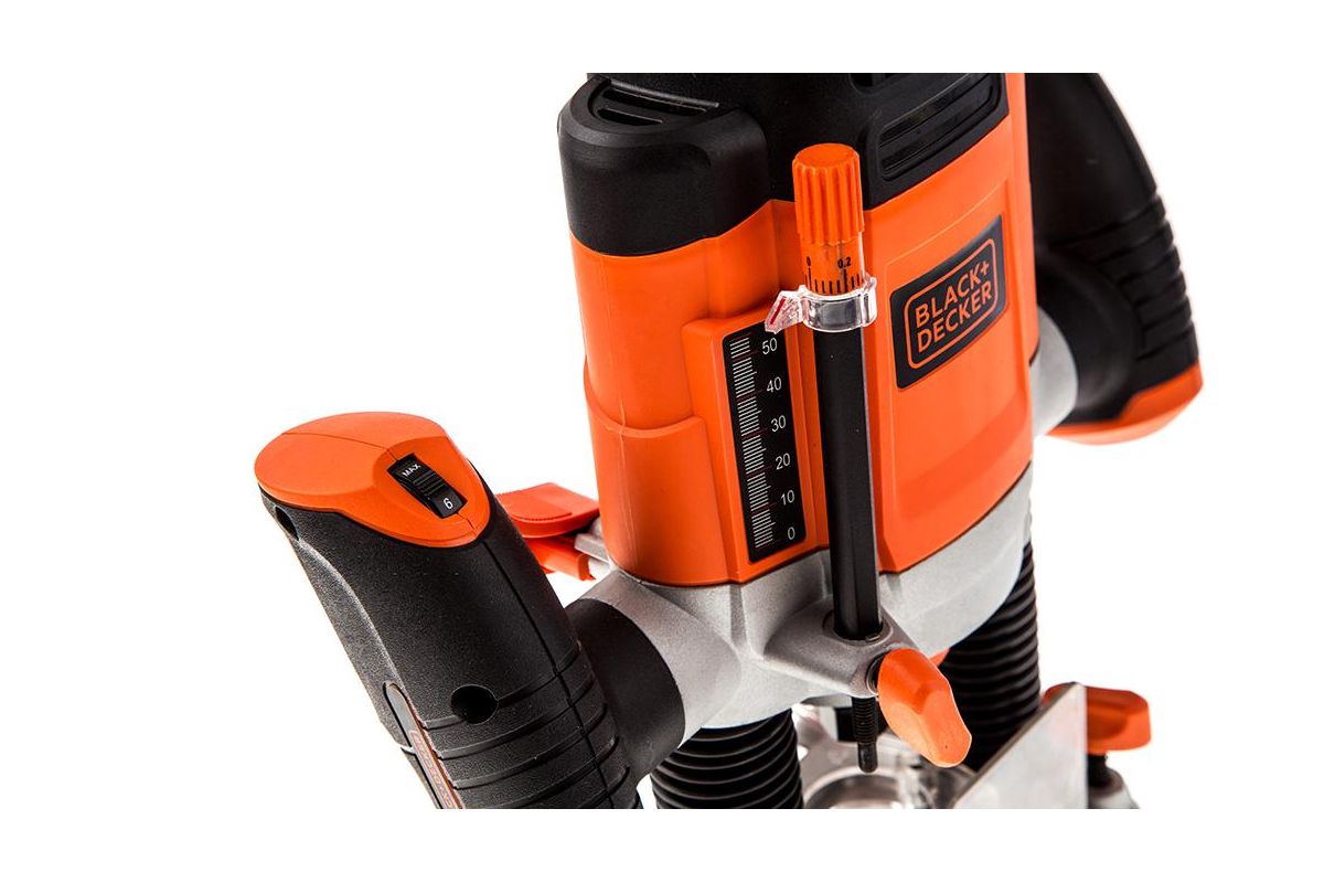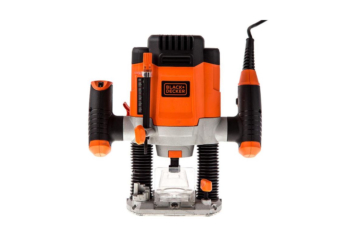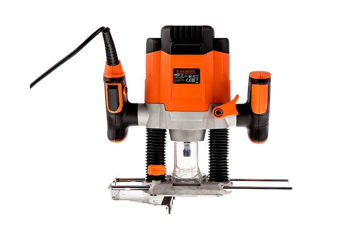Фрезер Black&Decker KW1200E подходит для фрезерования деревянных изделий. Скорость выставляется переключателем на ручке в диапазоне от 8000 до 28000 об/мин. На передней панели расположена миллиметровая шкала для визуального контроля необходимой глубины фрезеровки. Экран из прозрачного пластика защищает пользователя от летящей стружки и пыли. Мощность 1200 Вт. Максимальные обороты - 28000 об/мин.