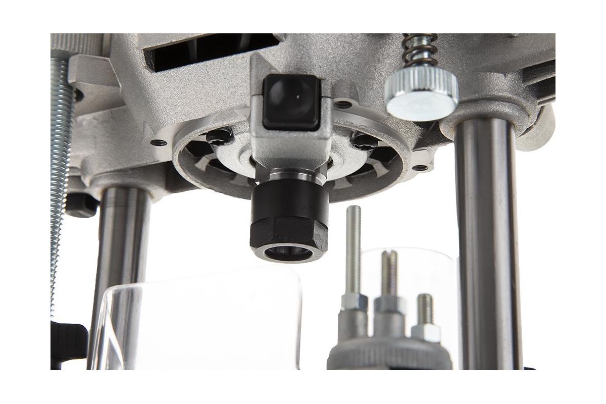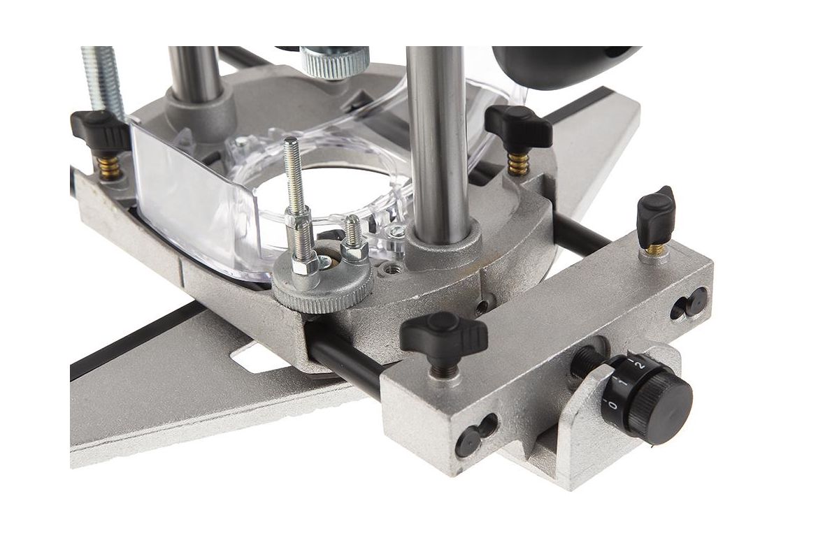 Фрезер готов работать по древесине различной твердости, по пластику и металлу. Это гарантируется электронным блоком управления скоростью. Можно выбрать один из пяти предусмотренных скоростных режимов и поддерживать его на протяжении всей работы. Система плавного пуска обеспечивает постепенное наращивание оборотов и предотвращает сход фрезы с разметочной линии. Фрезер оснащен системой удаления опилок с переходником для подключения пылесоса. Фрезер снабжен прецизионной системой регулировки глубины фрезерования. Трехступенчатый револьверный упор позволяет сократить время настройки при выполнении однотипных работ и при фрезеровке на большую глубину в несколько проходов.