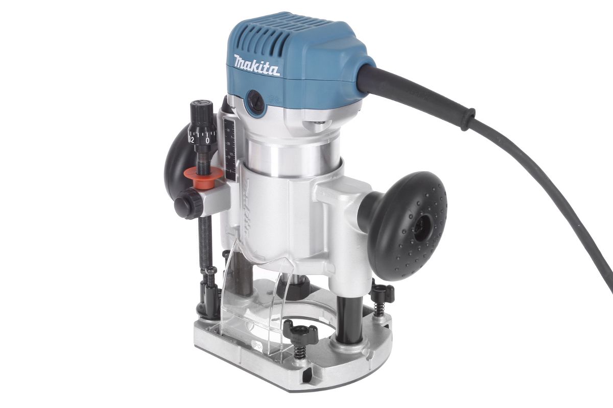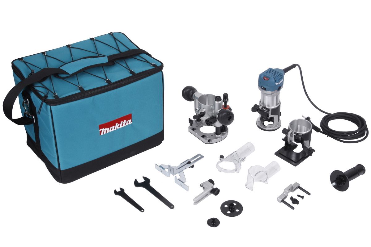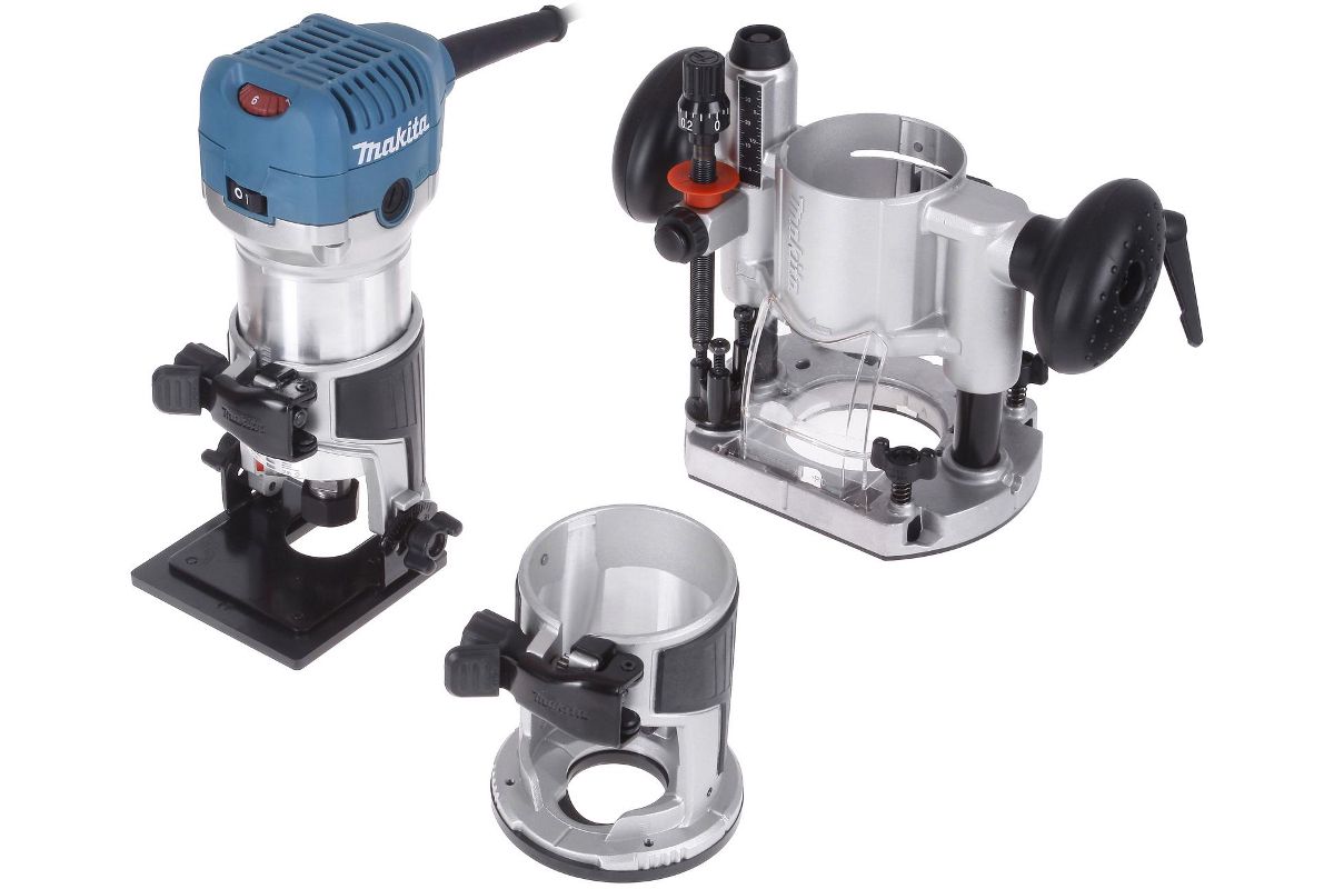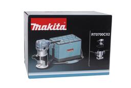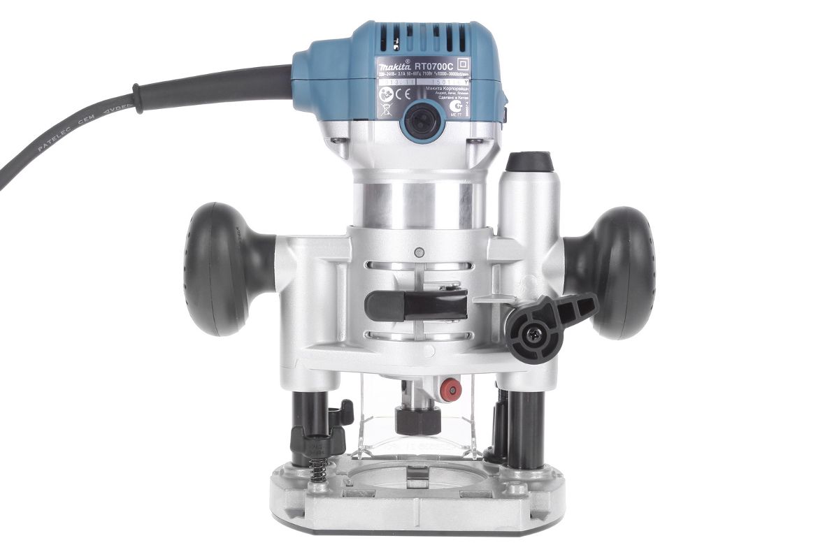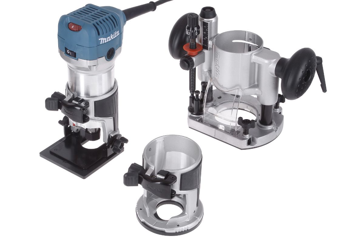 MAKITA RT0700CX2 — одноручный кромочный фрезер с 3 сменными основаниями: погружным, наклонным и фиксированным (прямой направляющей). Это инструмент профессионального класса, предназначенный для небольших работ (мощность 710 Вт). Прямая направляющая служит для копировальных работ, погружная подошва — для выборки пазов и отверстий (0-35 мм), а наклонная — для снятия фасок. Наклон можно установить до 30° в одну сторону и 45° в другую. Насадки крепятся в цангу диаметром 6 или 8 мм. В комплект входит также параллельный упор. С его помощью обеспечивается точность при выемке прямых пазов.