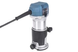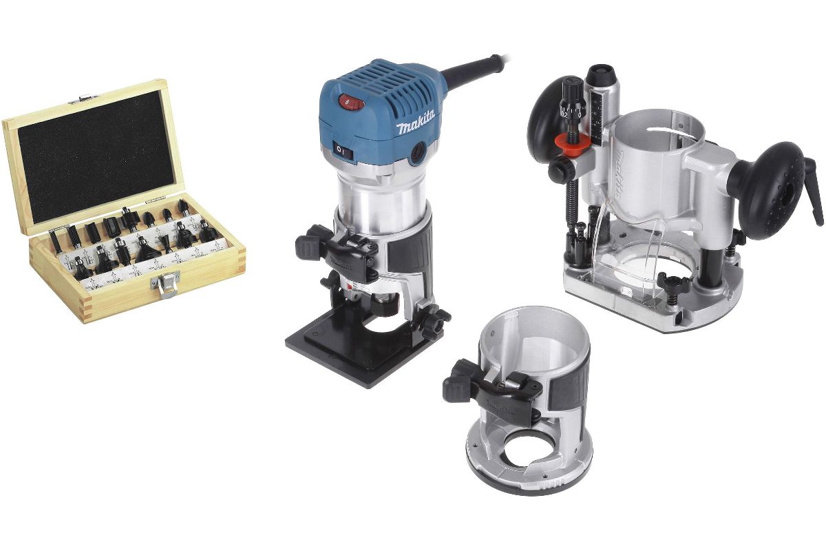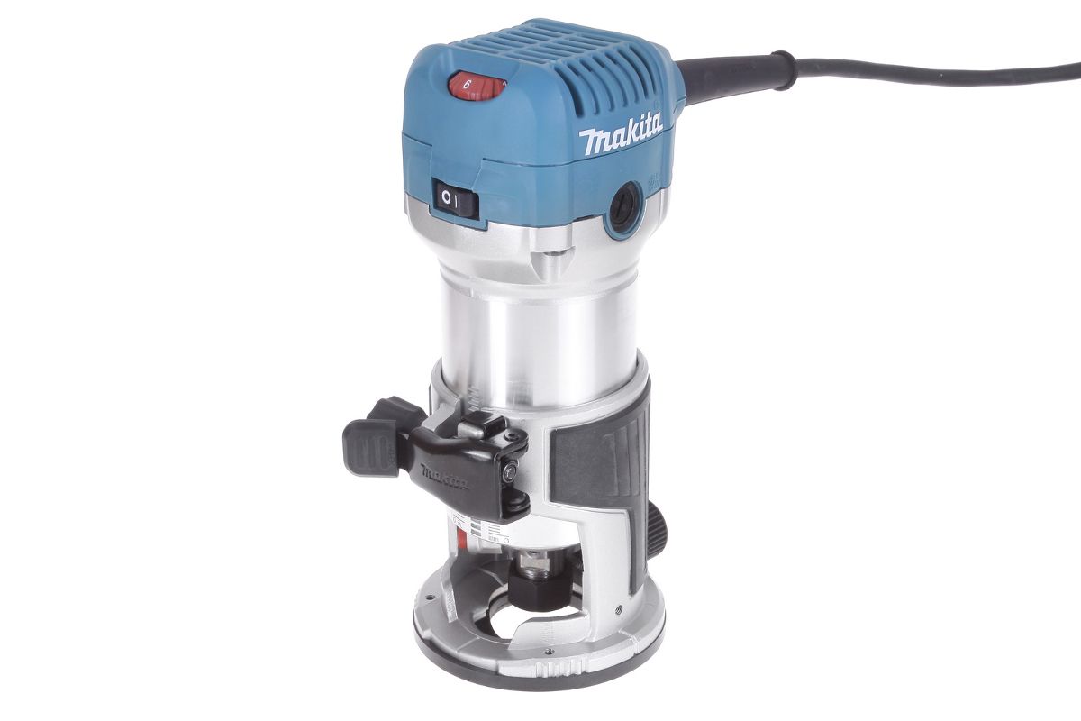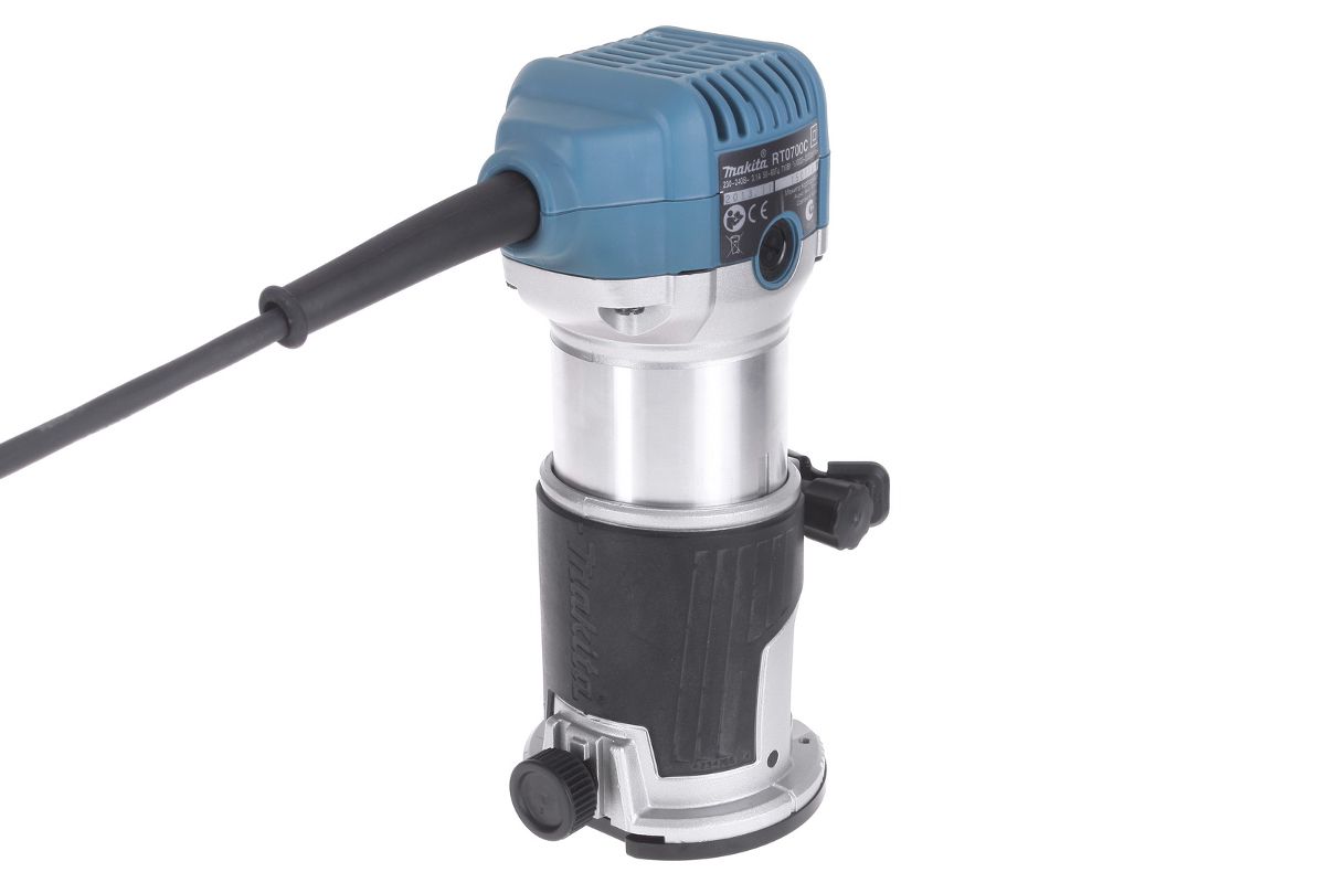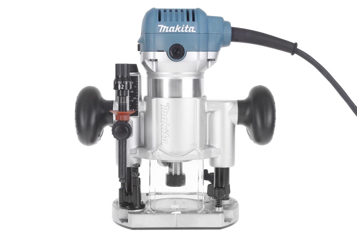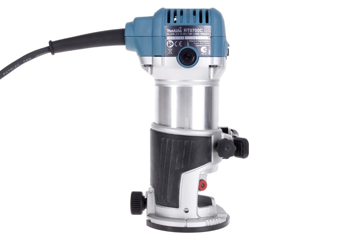 MAKITA RT0700CX2 — одноручный кромочный фрезер с 3 сменными основаниями: погружным, наклонным и фиксированным (прямой направляющей). Это инструмент профессионального класса, предназначенный для небольших работ (мощность 710 Вт). Прямая направляющая служит для копировальных работ, погружная подошва — для выборки пазов и отверстий (0-35 мм), а наклонная — для снятия фасок. Наклон можно установить до 30° в одну сторону и 45° в другую. Насадки крепятся в цангу диаметром 6 или 8 мм. В комплект входит также параллельный упор. С его помощью обеспечивается точность при выемке прямых пазов.
