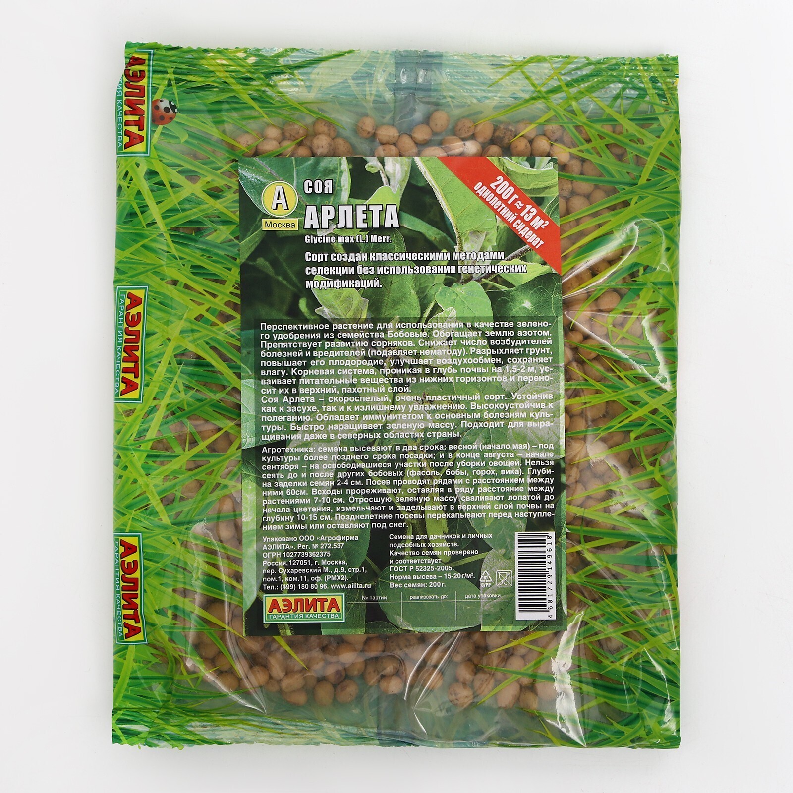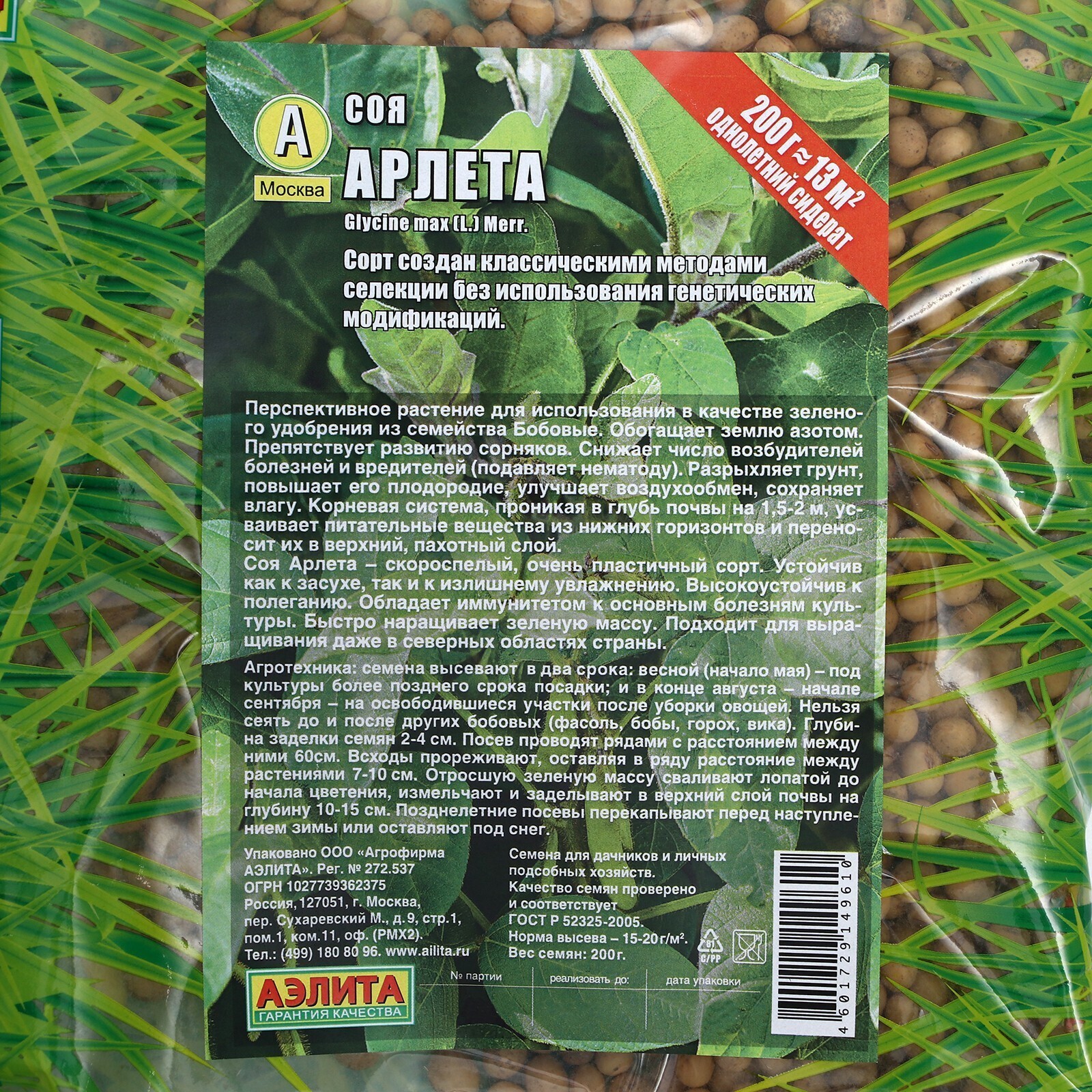 Перспективное растение для использования в качестве зеленого удобрения из семейства Бобовые.Обогащает землю азотом. Препятствует развитию сорняков. Снижает число возбудителей болезней и вредителей (подавляет нематоду). Разрыхляет грунт, повышает его плодородие, улучшает воздухообмен, сохраняет влагу. Корневая система, проникая в глубь почвы на 1,5-2 м, усваивает питательные вещества из нижних горизонтов и переносит их в верхний, пахотный слой.Соя Арлета – скороспелый, очень пластичный сорт. Устойчив как к засухе, так и к излишнему увлажнению. Высокоустойчив к полеганию. Обладает иммунитетом к основным болезням культуры. Быстро наращивает зеленую массу. Подходит для выращивания даже в северных областях страны.Агротехника: семена высевают в два срока: весной (начало мая) – под культуры более позднего срока посадки; и в конце августа – начале сентября – на освободившиеся участки после уборки овощей. Нельзя сеять до и после других бобовых (фасоль, бобы, горох, вика). Глубина заделки семян 2-4 см. Посев проводят рядами с расстоянием между ними 60см. Всходы прореживают, оставляя в ряду расстояние между растениями 7-10 см. Отросшую зеленую массу сваливают лопатой до начала цветения, измельчают и заделывают в верхний слой почвы на глубину 10-15 см. Позднелетние посевы перекапывают перед наступлением зимы или оставляют под снег.