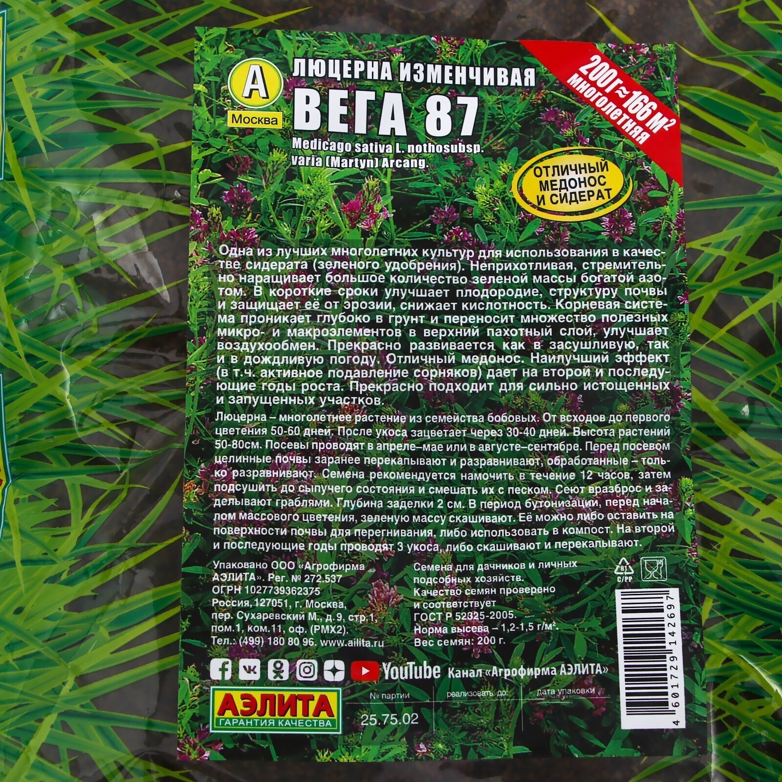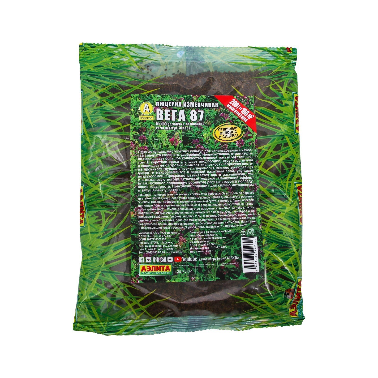 Семена люцерна "Вега 87" относятся к пестро гибридному сортотипу культуры. Куст вырастает прямостоячим, средней кустистости. Листья средние по размеру, эллиптической формы, по краям в верхней части. Соцветие представлено яйцевидной кистью длиной 3-5 см. Цветки пестрой окраски. Благодаря развитой корневой системе, растение получает из почвы повышенную дозу питательных веществ. Сорт семян люцерны "Вега 87" отличается зимостойкостью и устойчивостью к полеганию. Также культура не боится корневой гнили и других болезней.